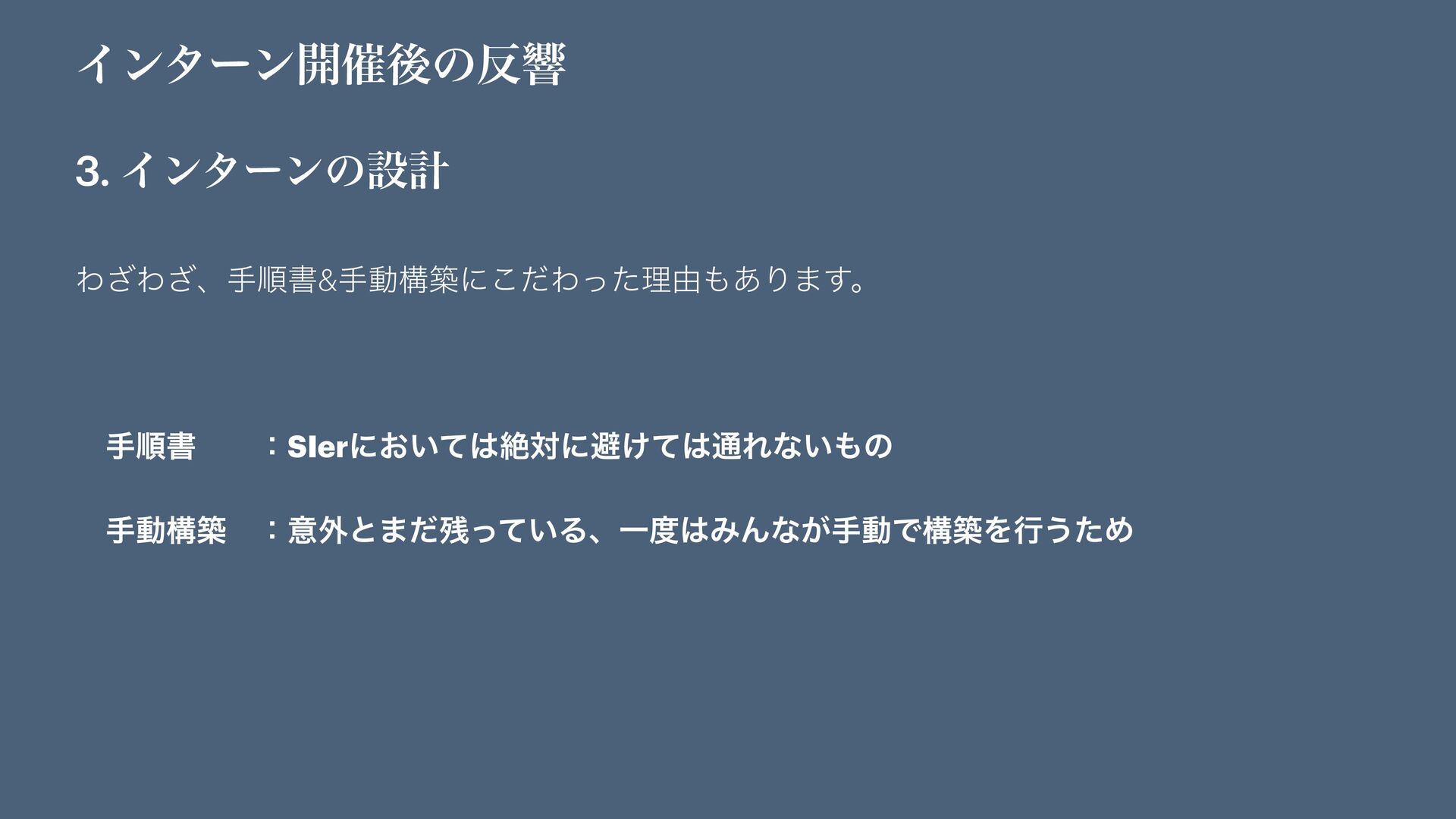 Θ͟Θ͟ɺखॱॻ&खಈߏஙʹͩ͜Θͬͨཧ༝͋Γ·͢ɻ ɹखॱॻɹɹɿSIerʹ͓͍ͯઈରʹආ͚ͯ௨Εͳ͍ͷ ɹखಈߏஙɹɿҙ֎ͱ·͍ͩͬͯΔɺҰΈΜͳ͕खಈͰߏஙΛߦ͏ͨΊ Πϯλʔϯ։࠵ޙͷڹ 3. Πϯλʔϯͷઃܭ
