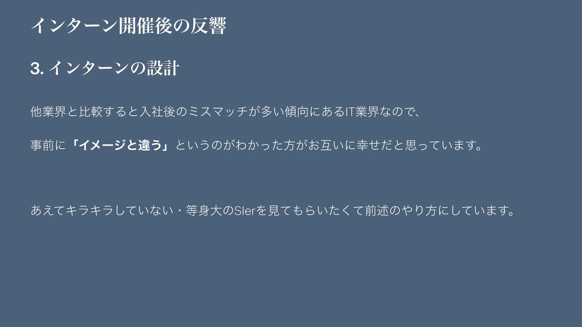 ଞۀքͱൺֱ͢ΔͱೖࣾޙͷϛεϚον͕ଟ͍ʹ͋ΔITۀքͳͷͰɺ ࣄલʹʮΠϝʔδͱҧ͏ʯͱ͍͏ͷ͕Θ͔ͬͨํ͕͓ޓ͍ʹͤͩͱࢥ͍ͬͯ·͢ɻ ͋͑ͯΩϥΩϥ͍ͯ͠ͳ͍ɾେͷSIerΛݟͯΒ͍ͨͯ͘લड़ͷΓํʹ͍ͯ͠·͢ɻ Πϯλʔϯ։࠵ޙͷڹ 3. Πϯλʔϯͷઃܭ