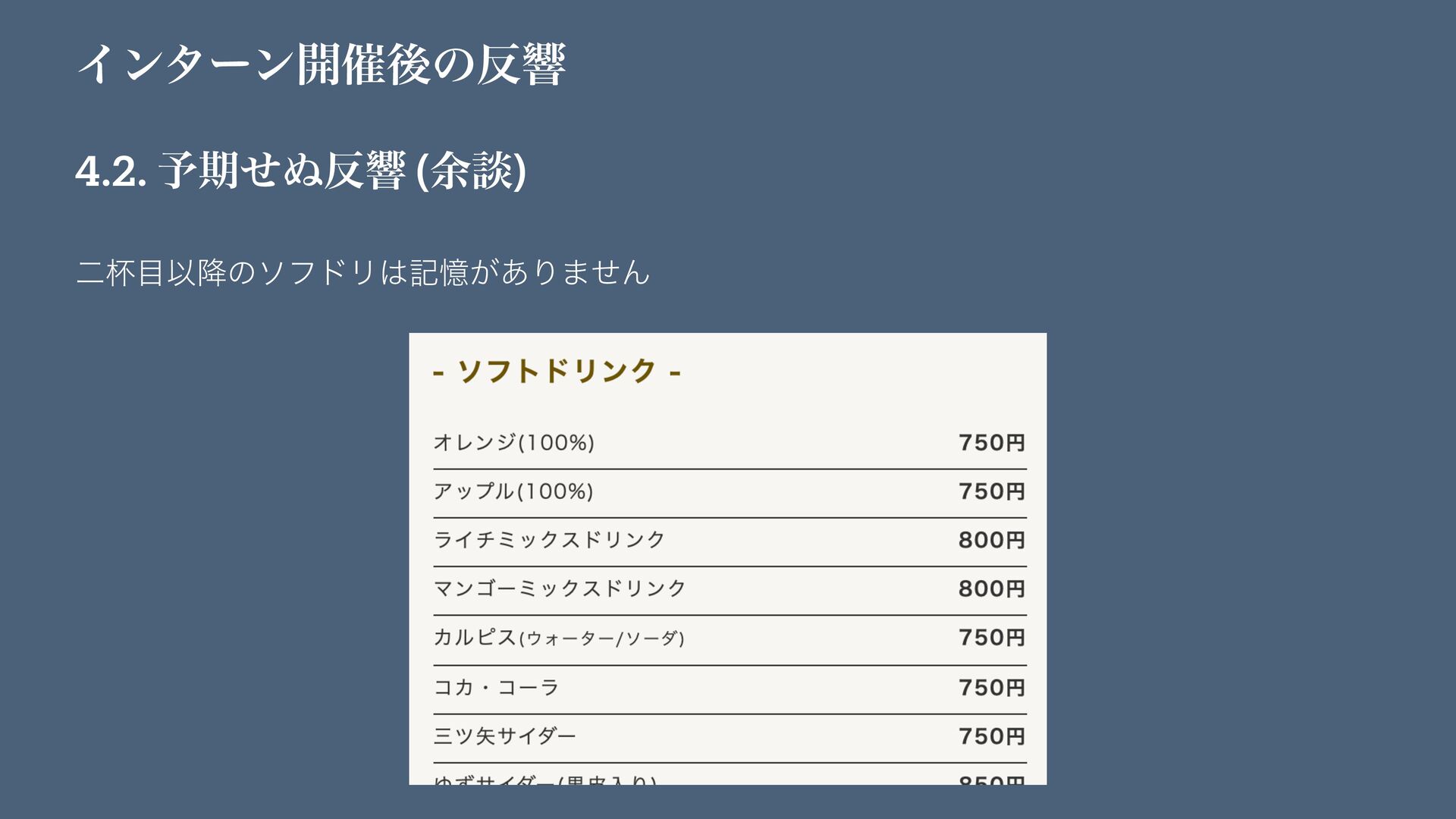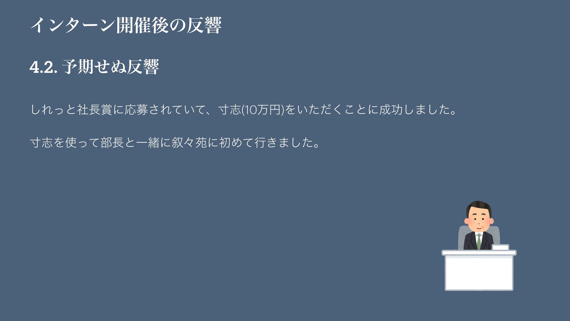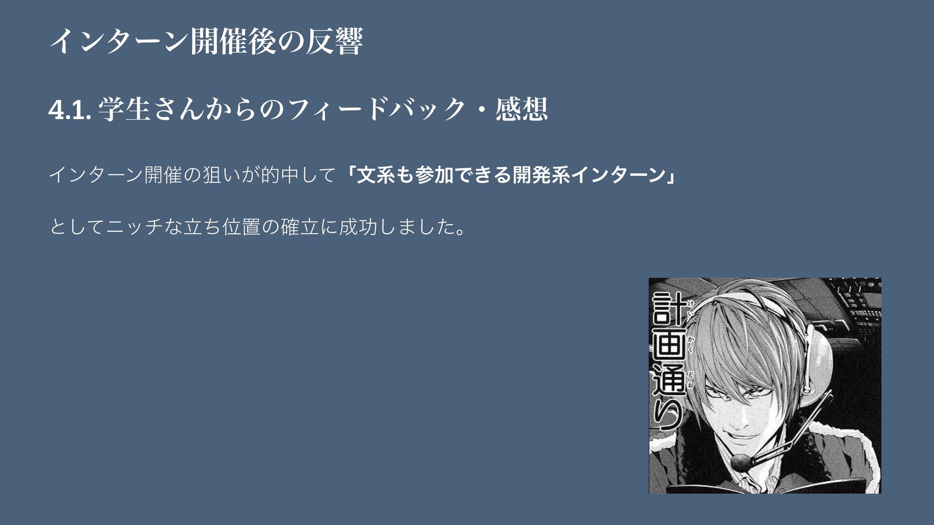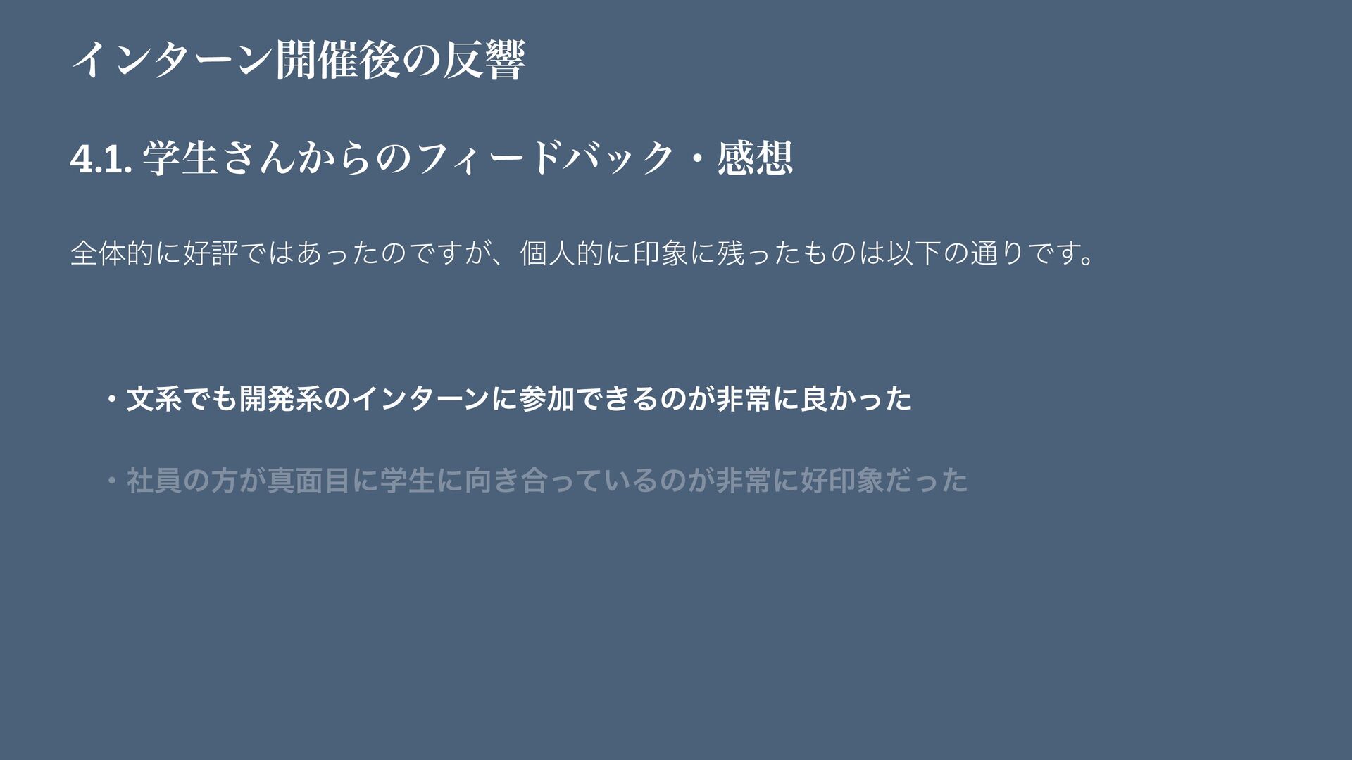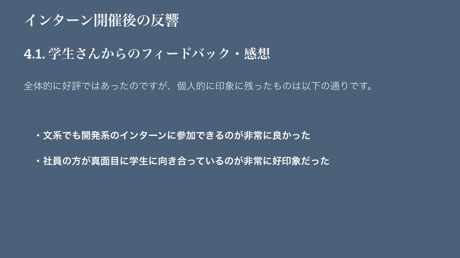શମతʹධͰ͋ͬͨͷͰ͕͢ɺݸਓతʹҹʹͬͨͷҎԼͷ௨ΓͰ͢ɻ ɹɾจܥͰ։ൃܥͷΠϯλʔϯʹࢀՃͰ͖Δͷ͕ඇৗʹྑ͔ͬͨ ɹɾࣾһͷํ͕ਅ໘ʹֶੜʹ͖߹͍ͬͯΔͷ͕ඇৗʹҹͩͬͨ Πϯλʔϯ։࠵ޙͷڹ 4.1. ֶੜ͞Μ͔ΒͷϑΟʔυόοΫɾײ
