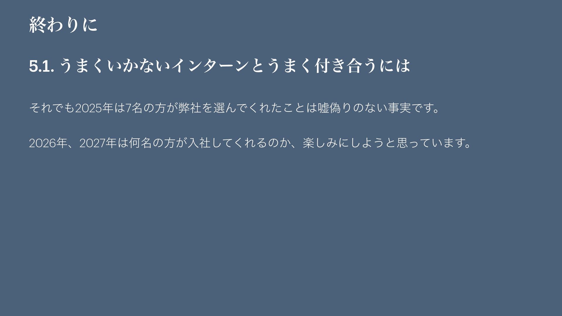 ͦΕͰ20257໊ͷํ͕ฐࣾΛબΜͰ͘Εͨ͜ͱӕِΓͷͳ͍ࣄ࣮Ͱ͢ɻ 2026ɺ2027Կ໊ͷํ͕ೖࣾͯ͘͠ΕΔͷ͔ɺָ͠Έʹ͠Α͏ͱࢥ͍ͬͯ·͢ɻ ऴΘΓʹ 5.1. ͏·͍͔͘ͳ͍Πϯλʔϯͱ͏·͖͘߹͏ʹ