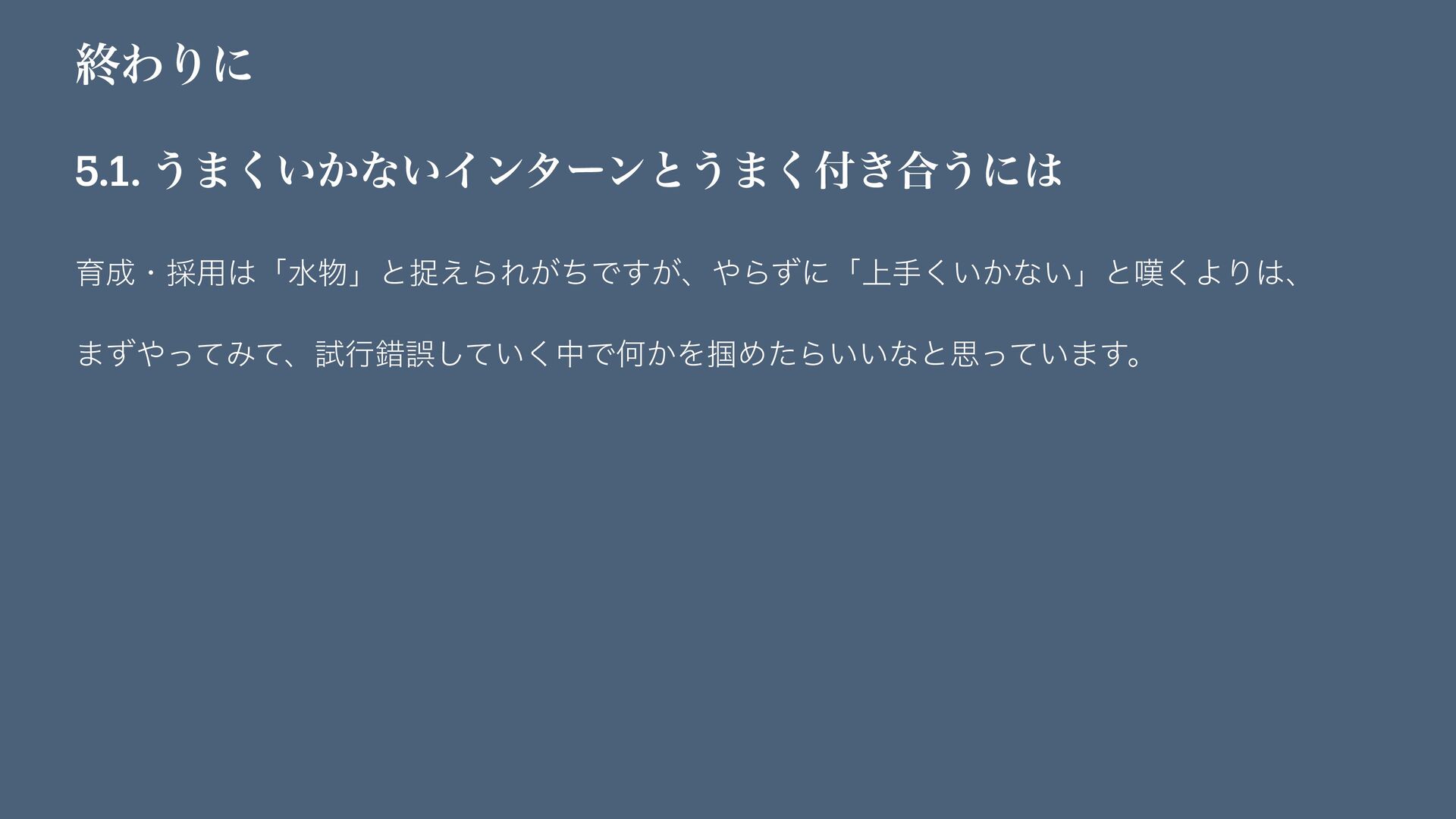 ҭɾ࠾༻ʮਫʯͱଊ͑ΒΕ͕ͪͰ͕͢ɺΒͣʹʮ্ख͍͔͘ͳ͍ʯͱ୰͘ΑΓɺ ·ͣͬͯΈͯɺࢼߦࡨޡ͍ͯ͘͠தͰԿ͔Λ௫ΊͨΒ͍͍ͳͱࢥ͍ͬͯ·͢ɻ ऴΘΓʹ 5.1. ͏·͍͔͘ͳ͍Πϯλʔϯͱ͏·͖͘߹͏ʹ