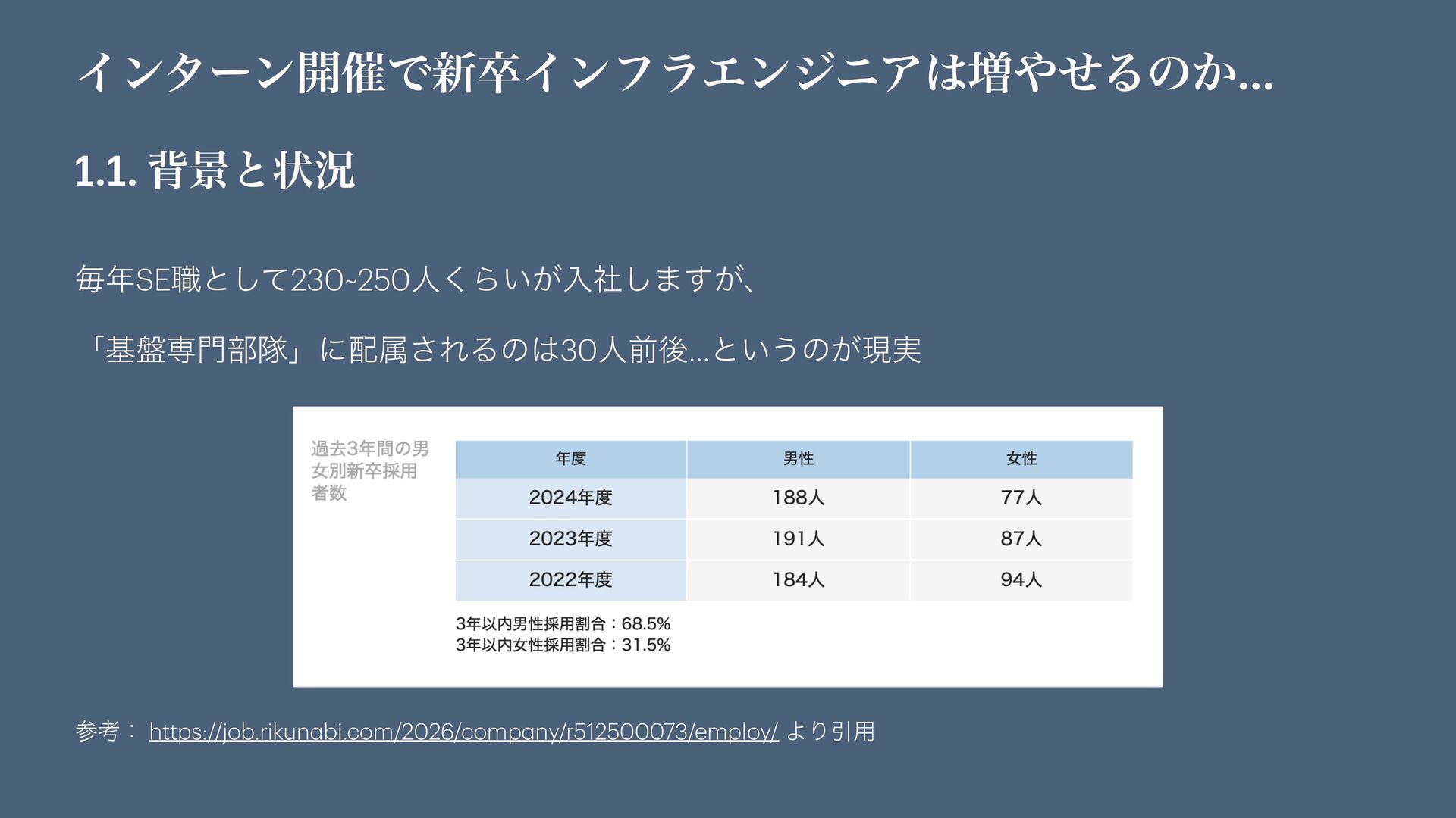 Πϯλʔϯ։࠵Ͱ৽ଔΠϯϑϥΤϯδχΞ૿ͤΔͷ͔… 1.1. എܠͱঢ়گ ຖSE৬ͱͯ͠230~250ਓ͘Β͍͕ೖࣾ͠·͕͢ɺ ʮج൫ઐ෦ୂʯʹଐ͞ΕΔͷ30ਓલޙ…ͱ͍͏ͷ͕ݱ࣮ ࢀߟɿ https://job.rikun a bi.com/2026/comp a
