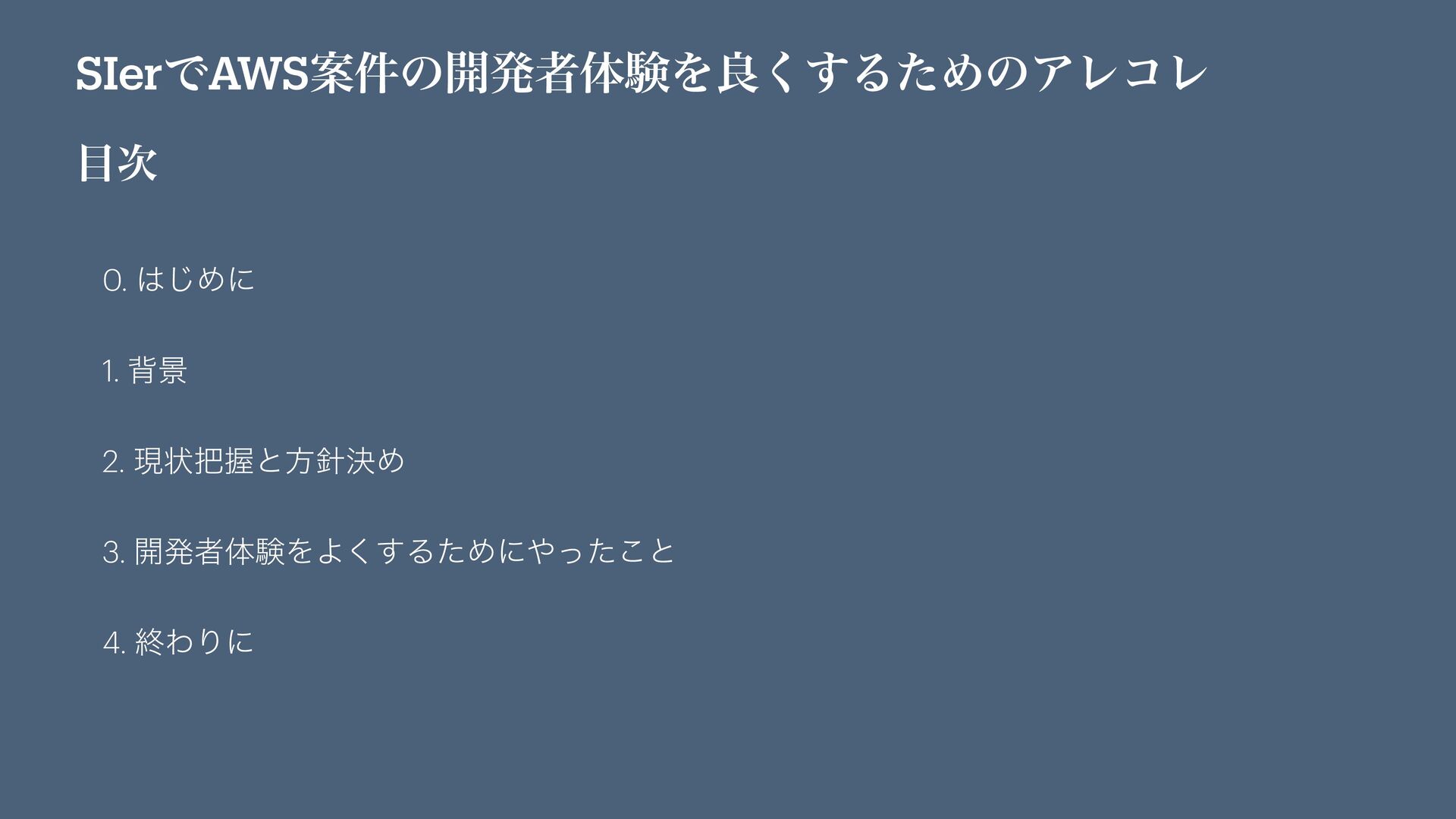 SIerͰAWSҊ݅ͷ։ൃऀମݧΛྑ͘͢ΔͨΊͷΞϨίϨ ࣍ 0. ͡Ίʹ 1. എܠ 2. ݱঢ়ѲͱํܾΊ 3. ։ൃऀମݧΛΑ͘͢ΔͨΊʹͬͨ͜ͱ