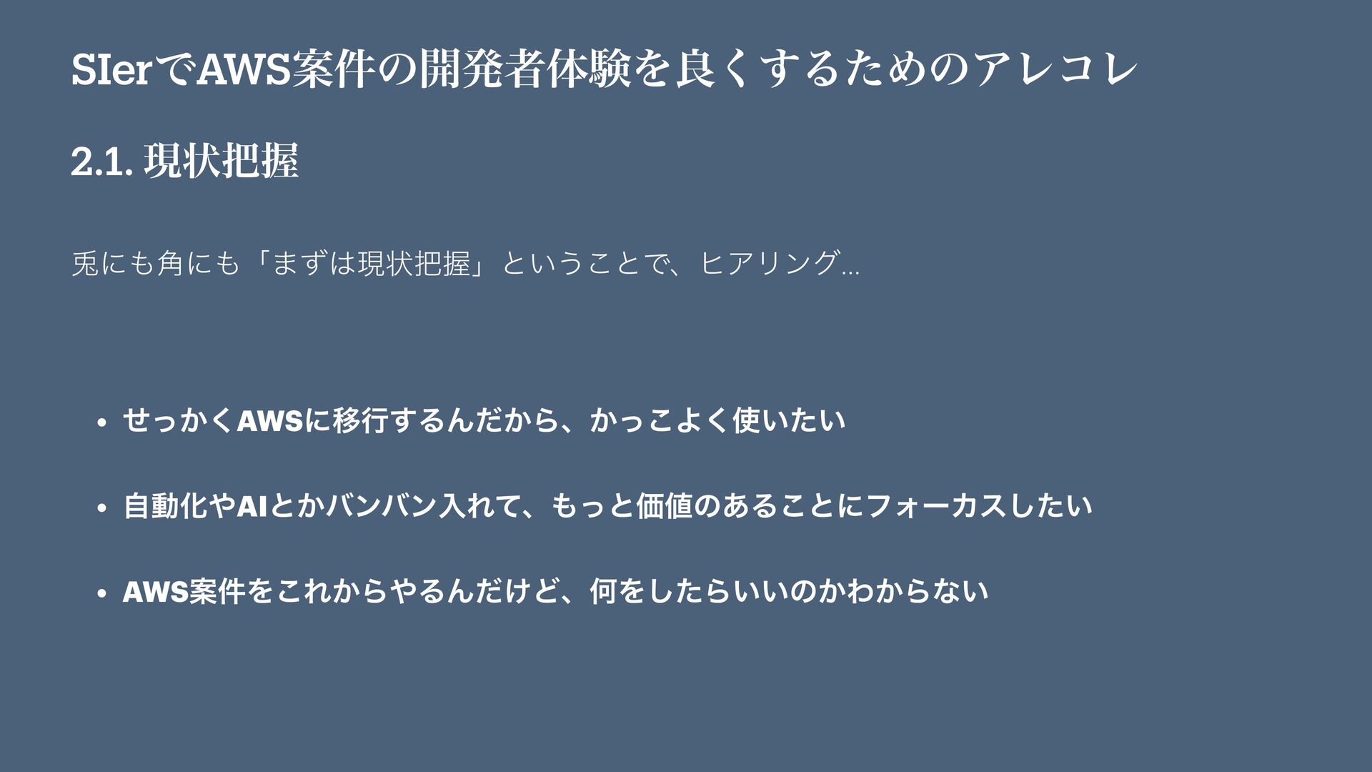 SIerͰAWSҊ݅ͷ։ൃऀମݧΛྑ͘͢ΔͨΊͷΞϨίϨ 2.1. ݱঢ়Ѳ 㙽ʹ֯ʹʮ·ͣݱঢ়Ѳʯͱ͍͏͜ͱͰɺώΞϦϯά… • ͔ͤͬ͘AWSʹҠߦ͢ΔΜ͔ͩΒɺ͔ͬ͜Α͍͍ͨ͘ • ࣗಈԽAIͱ͔όϯόϯೖΕͯɺͬͱՁͷ͋Δ͜ͱʹϑΥʔΧε͍ͨ͠ • AWSҊ݅Λ͜Ε͔ΒΔΜ͚ͩͲɺԿΛͨ͠Β͍͍ͷ͔Θ͔Βͳ͍