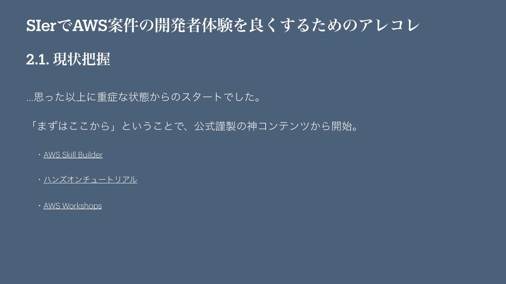 SIerͰAWSҊ݅ͷ։ൃऀମݧΛྑ͘͢ΔͨΊͷΞϨίϨ 2.1. ݱঢ়Ѳ …ࢥͬͨҎ্ʹॏͳঢ়ଶ͔ΒͷελʔτͰͨ͠ɻ ʮ·͔ͣ͜͜Βʯͱ͍͏͜ͱͰɺެࣜۘͷਆίϯςϯπ͔Β։࢝ɻ ɾAWS Skill Builder ɾϋϯζΦϯνϡʔτϦΞϧ ɾAWS