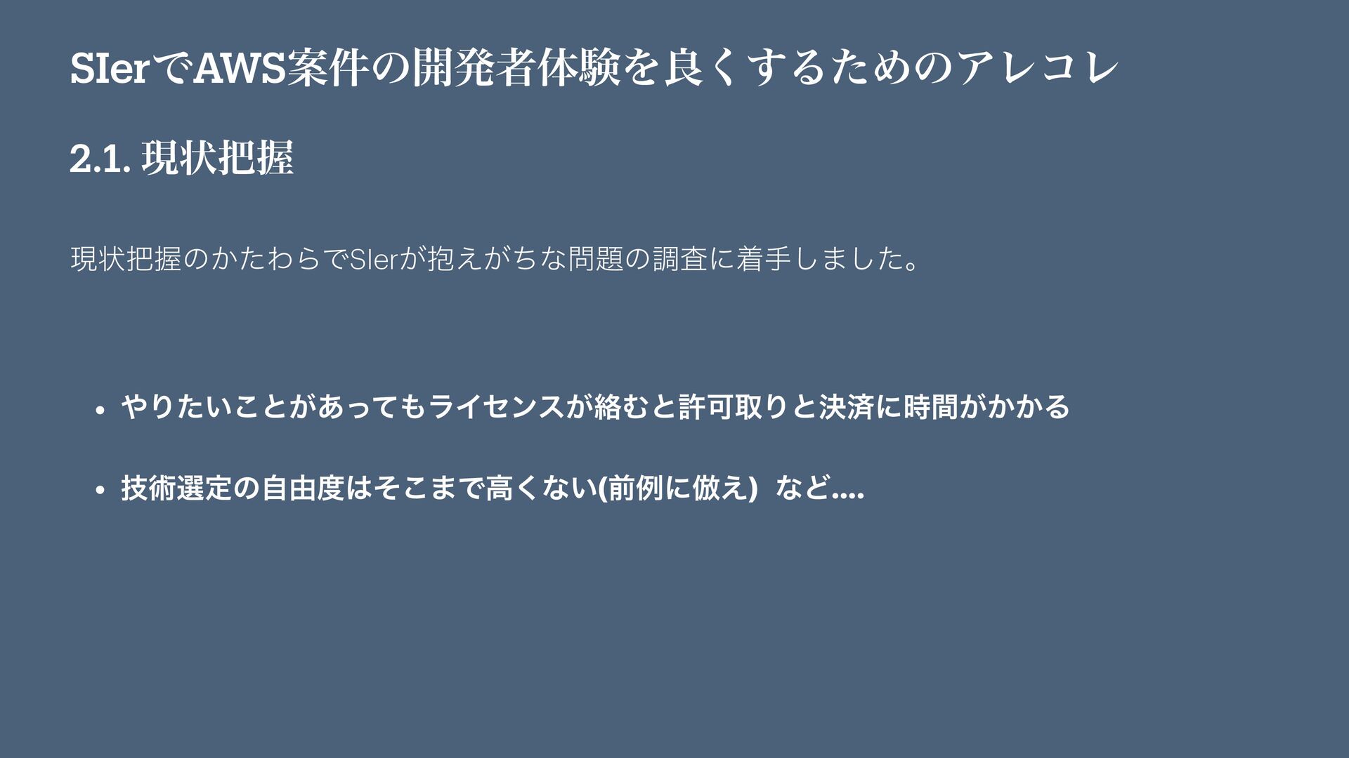 SIerͰAWSҊ݅ͷ։ൃऀମݧΛྑ͘͢ΔͨΊͷΞϨίϨ 2.1. ݱঢ়Ѳ ݱঢ়Ѳͷ͔ͨΘΒͰSIer๊͕͕͑ͪͳͷௐࠪʹணख͠·ͨ͠ɻ • Γ͍ͨ͜ͱ͕͋ͬͯϥΠηϯε͕བྷΉͱڐՄऔΓͱܾࡁʹ͕͔͔࣌ؒΔ • ٕज़બఆͷࣗ༝ͦ͜·Ͱߴ͘ͳ͍(લྫʹ฿͑) ͳͲ….