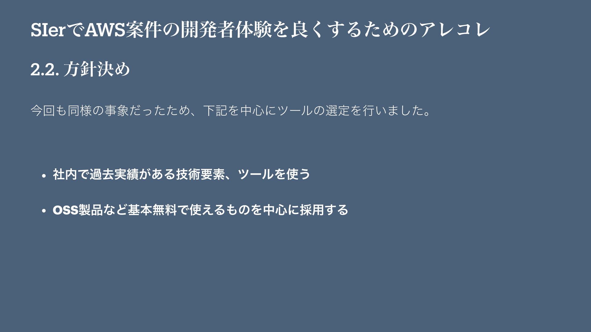 SIerͰAWSҊ݅ͷ։ൃऀମݧΛྑ͘͢ΔͨΊͷΞϨίϨ 2.2. ํܾΊ ࠓճಉ༷ͷࣄͩͬͨͨΊɺԼهΛத৺ʹπʔϧͷબఆΛߦ͍·ͨ͠ɻ • ࣾͰաڈ࣮͕͋Δٕज़ཁૉɺπʔϧΛ͏ • OSSͳͲجຊແྉͰ͑ΔͷΛத৺ʹ࠾༻͢Δ