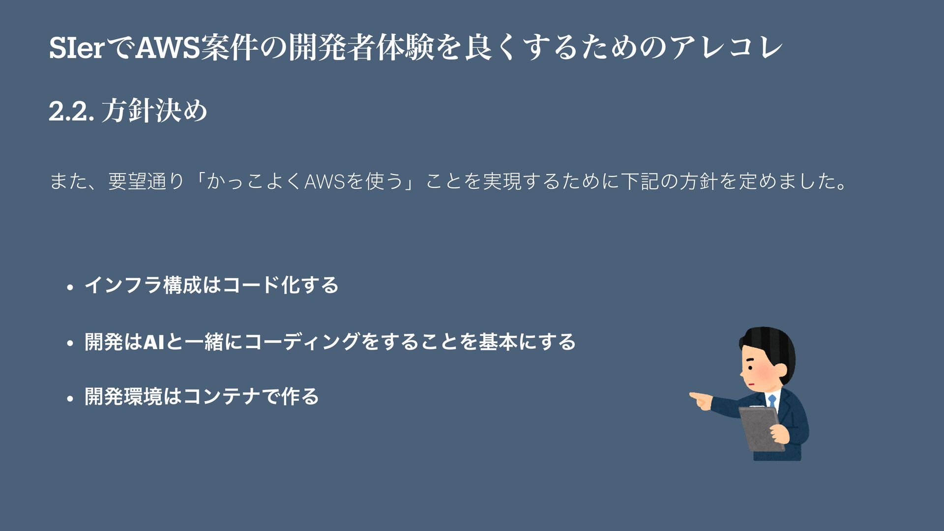 SIerͰAWSҊ݅ͷ։ൃऀମݧΛྑ͘͢ΔͨΊͷΞϨίϨ 2.2. ํܾΊ ·ͨɺཁ௨Γʮ͔ͬ͜Α͘AWSΛ͏ʯ͜ͱΛ࣮ݱ͢ΔͨΊʹԼهͷํΛఆΊ·ͨ͠ɻ • ΠϯϑϥߏίʔυԽ͢Δ • ։ൃAIͱҰॹʹίʔσΟϯάΛ͢Δ͜ͱΛجຊʹ͢Δ • ։ൃڥίϯςφͰ࡞Δ
