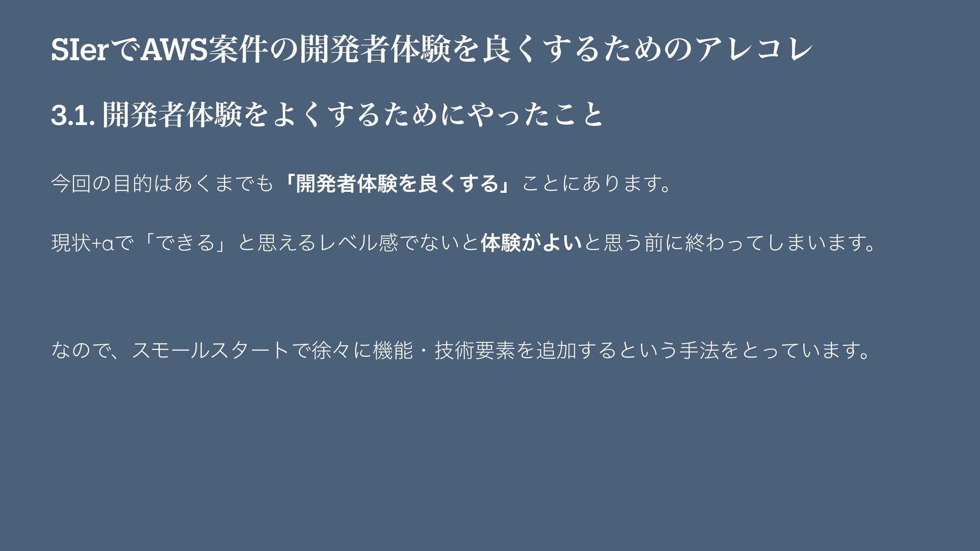 SIerͰAWSҊ݅ͷ։ൃऀମݧΛྑ͘͢ΔͨΊͷΞϨίϨ 3.1. ։ൃऀମݧΛΑ͘͢ΔͨΊʹͬͨ͜ͱ ࠓճͷత͋͘·Ͱʮ։ൃऀମݧΛྑ͘͢Δʯ͜ͱʹ͋Γ·͢ɻ ݱঢ়+αͰʮͰ͖Δʯͱࢥ͑ΔϨϕϧײͰͳ͍ͱମݧ͕Α͍ͱࢥ͏લʹऴΘͬͯ͠·͍·͢ɻ ͳͷͰɺεϞʔϧελʔτͰঃʑʹػೳɾٕज़ཁૉΛՃ͢Δͱ͍͏ख๏Λͱ͍ͬͯ·͢ɻ