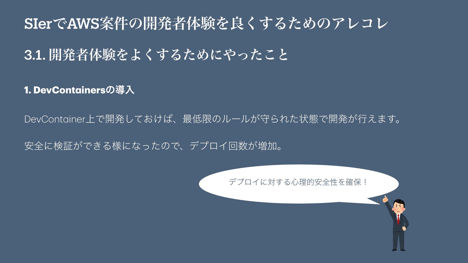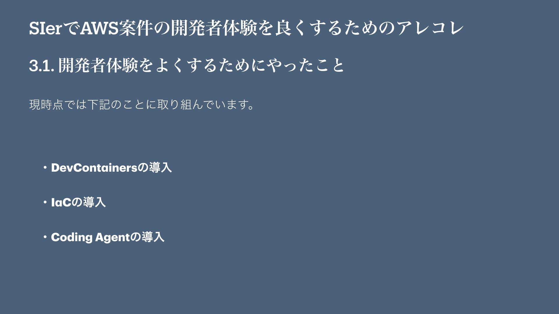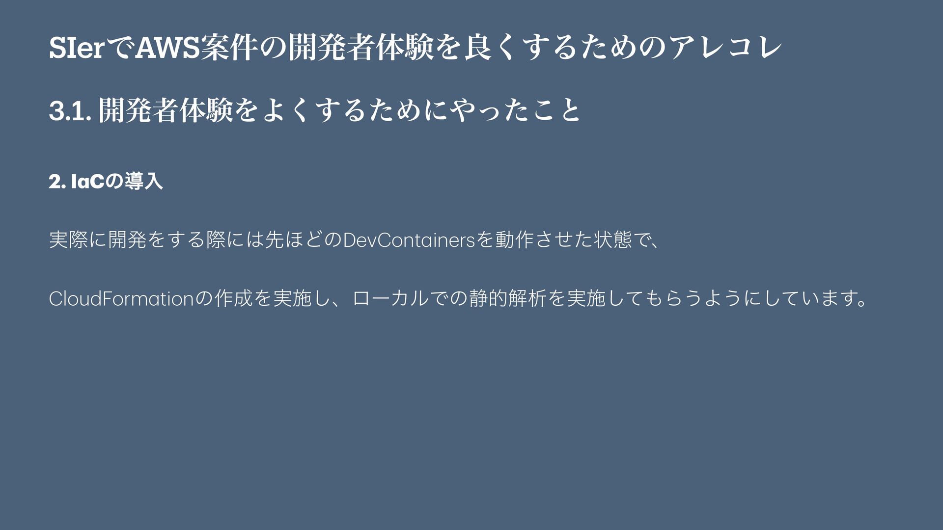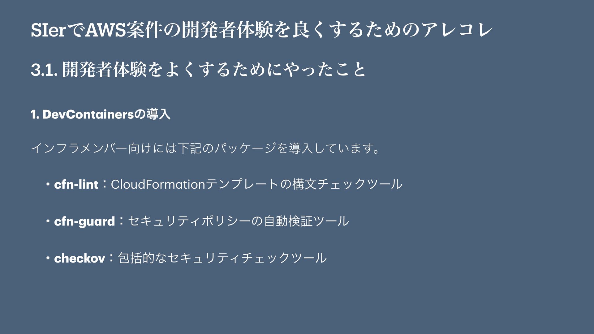 SIerͰAWSҊ݅ͷ։ൃऀମݧΛྑ͘͢ΔͨΊͷΞϨίϨ 3.1. ։ൃऀମݧΛΑ͘͢ΔͨΊʹͬͨ͜ͱ ݱ࣌ͰԼهͷ͜ͱʹऔΓΜͰ͍·͢ɻ ɾDevCont a inersͷಋೖ ɾI a Cͷಋೖ
