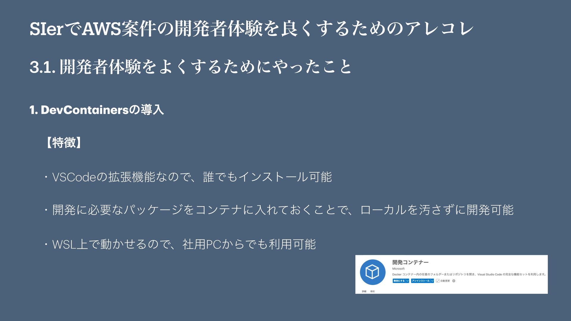 SIerͰAWSҊ݅ͷ։ൃऀମݧΛྑ͘͢ΔͨΊͷΞϨίϨ 3.1. ։ൃऀମݧΛΑ͘͢ΔͨΊʹͬͨ͜ͱ 1. DevCont a inersͷಋೖ ʲಛʳ ɾVSCodeͷ֦ுػೳͳͷͰɺ୭ͰΠϯετʔϧՄೳ ɾ։ൃʹඞཁͳύοέʔδΛίϯςφʹೖΕ͓ͯ͘͜ͱͰɺϩʔΧϧΛԚͣ͞ʹ։ൃՄೳ