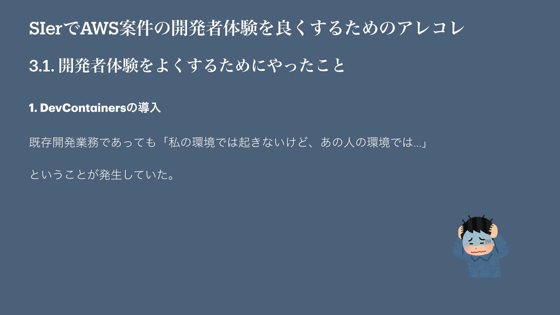 SIerͰAWSҊ݅ͷ։ൃऀମݧΛྑ͘͢ΔͨΊͷΞϨίϨ 3.1. ։ൃऀମݧΛΑ͘͢ΔͨΊʹͬͨ͜ͱ 2. I a Cͷಋೖ ࣮ࡍʹ։ൃΛ͢Δࡍʹઌ΄ͲͷDevCont a inersΛಈ࡞ͤͨ͞ঢ়ଶͰɺ