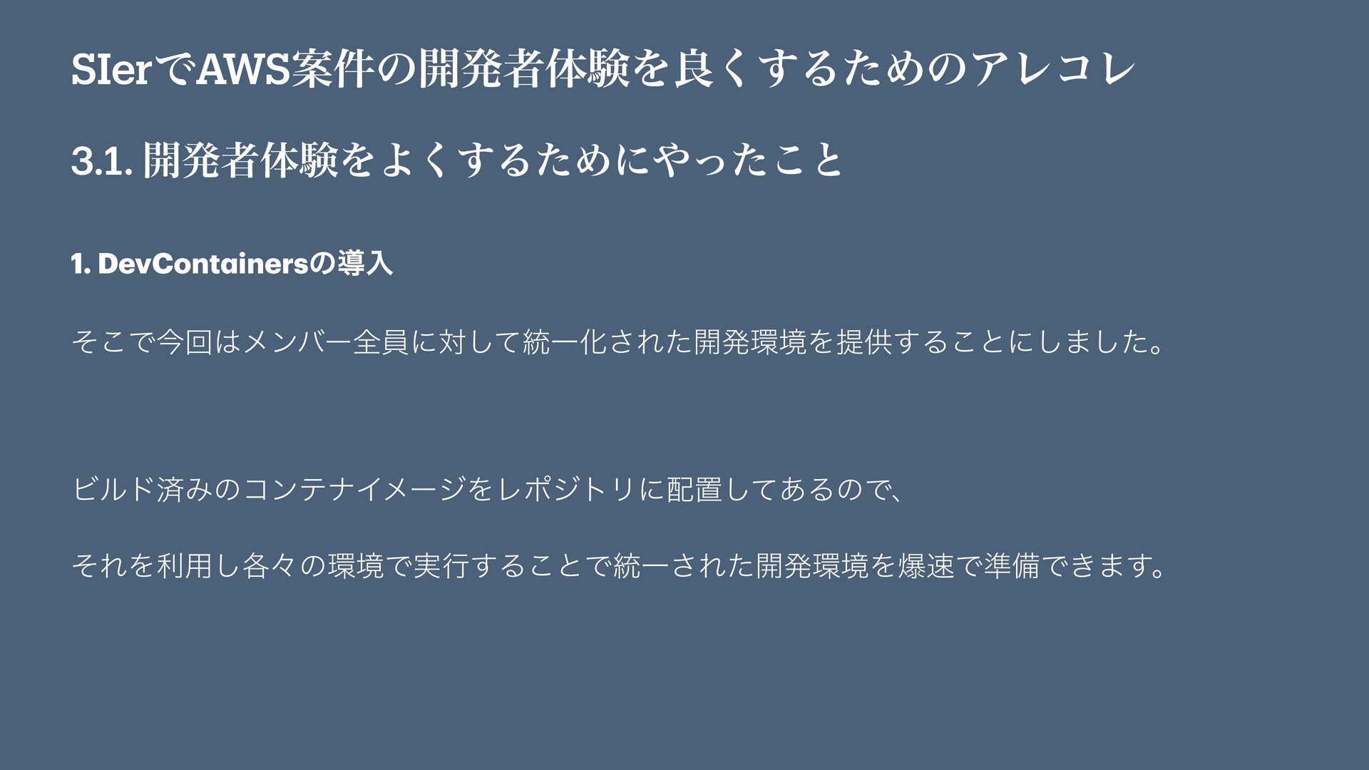 SIerͰAWSҊ݅ͷ։ൃऀମݧΛྑ͘͢ΔͨΊͷΞϨίϨ 3.1. ։ൃऀମݧΛΑ͘͢ΔͨΊʹͬͨ͜ͱ 1. DevCont a inersͷಋೖ ͦ͜Ͱࠓճϝϯόʔશһʹରͯ͠౷ҰԽ͞Εͨ։ൃڥΛఏڙ͢Δ͜ͱʹ͠·ͨ͠ɻ ϏϧυࡁΈͷίϯςφΠϝʔδΛϨϙδτϦʹஔͯ͋͠ΔͷͰɺ ͦΕΛར༻֤͠ʑͷڥͰ࣮ߦ͢Δ͜ͱͰ౷Ұ͞Εͨ։ൃڥΛരͰ४උͰ͖·͢ɻ