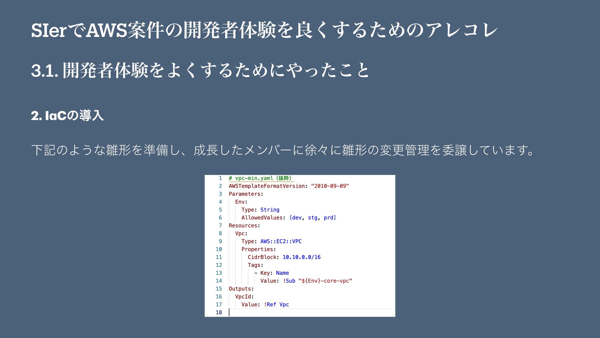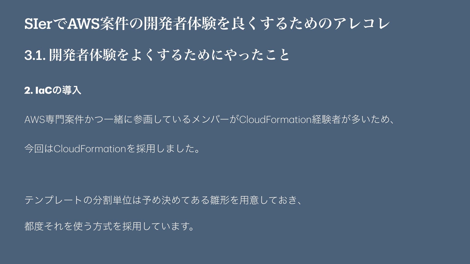 SIerͰAWSҊ݅ͷ։ൃऀମݧΛྑ͘͢ΔͨΊͷΞϨίϨ 3.1. ։ൃऀମݧΛΑ͘͢ΔͨΊʹͬͨ͜ͱ 2. I a Cͷಋೖ AWSઐҊ͔݅ͭҰॹʹࢀը͍ͯ͠Δϝϯόʔ͕CloudForm a tionܦݧऀ͕ଟ͍ͨΊɺ