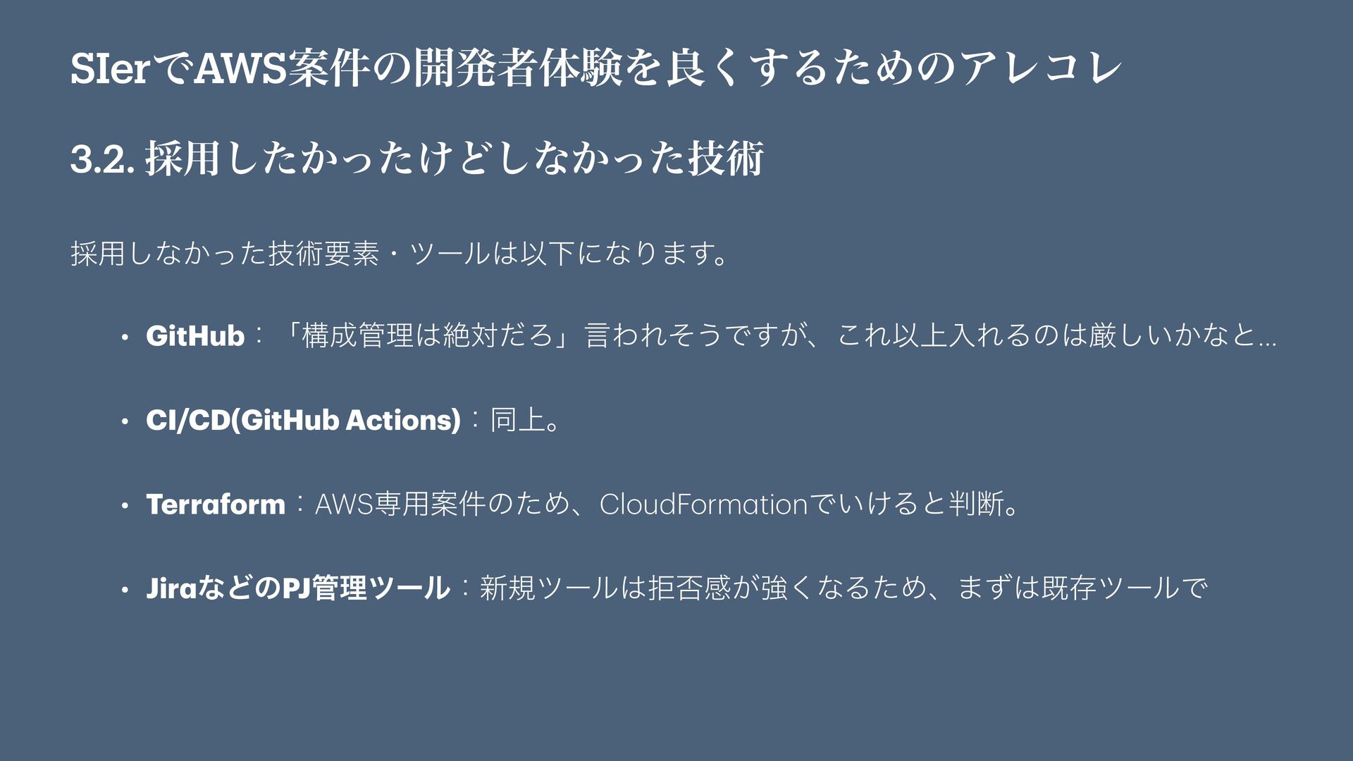 SIerͰAWSҊ݅ͷ։ൃऀମݧΛྑ͘͢ΔͨΊͷΞϨίϨ 3.2. ࠾༻͔͚ͨͬͨ͠Ͳ͠ͳ͔ٕͬͨज़ ࠾༻͠ͳ͔ٕͬͨज़ཁૉɾπʔϧҎԼʹͳΓ·͢ɻ • GitHubɿʮߏཧઈରͩΖʯݴΘΕͦ͏Ͱ͕͢ɺ͜ΕҎ্ೖΕΔͷݫ͍͔͠ͳͱ… • CI/CD(GitHub Actions)ɿಉ্ɻ •