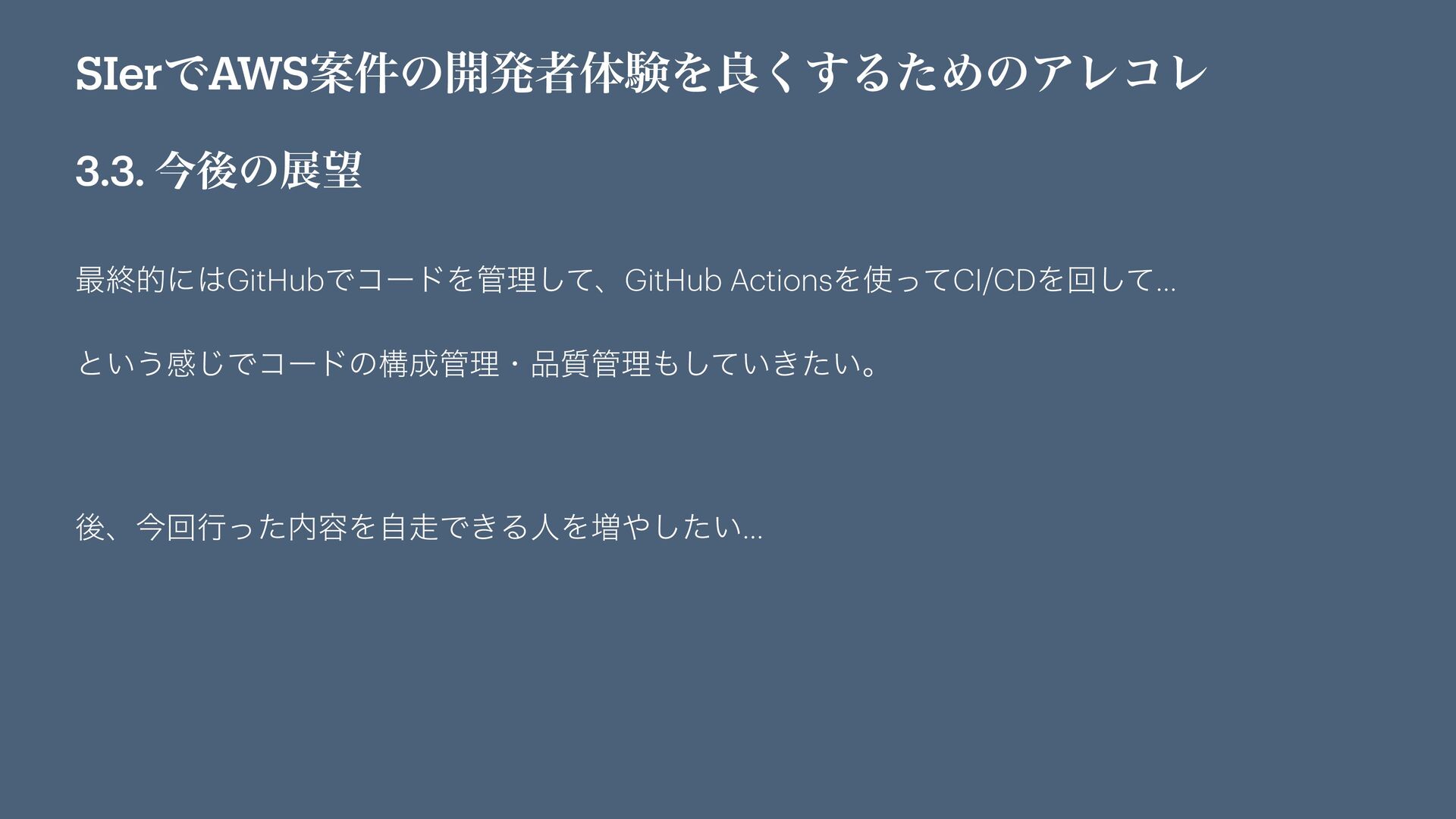 SIerͰAWSҊ݅ͷ։ൃऀମݧΛྑ͘͢ΔͨΊͷΞϨίϨ 3.3. ࠓޙͷల ࠷ऴతʹGitHubͰίʔυΛཧͯ͠ɺGitHub ActionsΛͬͯCI/CDΛճͯ͠… ͱ͍͏ײ͡Ͱίʔυͷߏཧɾ࣭ཧ͍͖͍ͯͨ͠ɻ ޙɺࠓճߦͬͨ༰ΛࣗͰ͖ΔਓΛ૿͍ͨ͠…