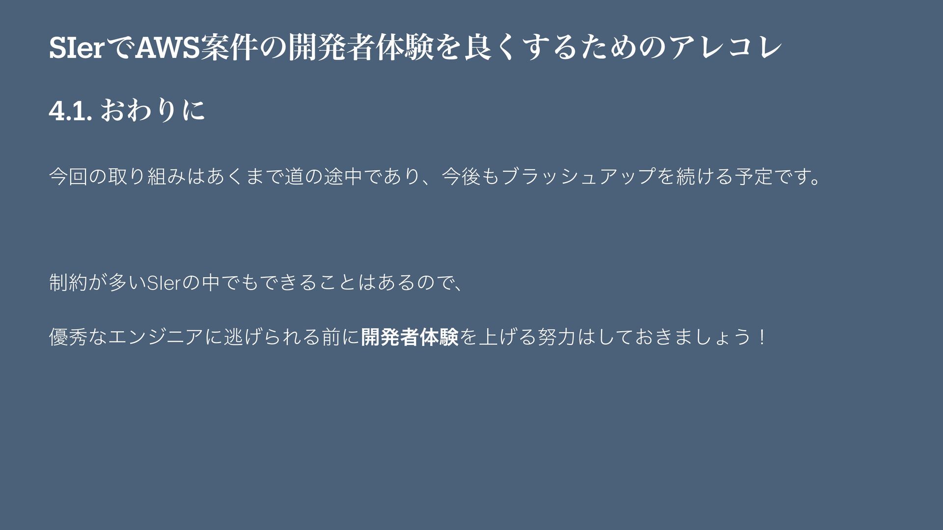 SIerͰAWSҊ݅ͷ։ൃऀମݧΛྑ͘͢ΔͨΊͷΞϨίϨ 4.1. ͓ΘΓʹ ࠓճͷऔΓΈ͋͘·Ͱಓͷ్தͰ͋ΓɺࠓޙϒϥογϡΞοϓΛଓ͚Δ༧ఆͰ͢ɻ ੍͕ଟ͍SIerͷதͰͰ͖Δ͜ͱ͋ΔͷͰɺ ༏लͳΤϯδχΞʹಀ͛ΒΕΔલʹ։ൃऀମݧΛ্͛Δྗ͓͖ͯ͠·͠ΐ͏ʂ