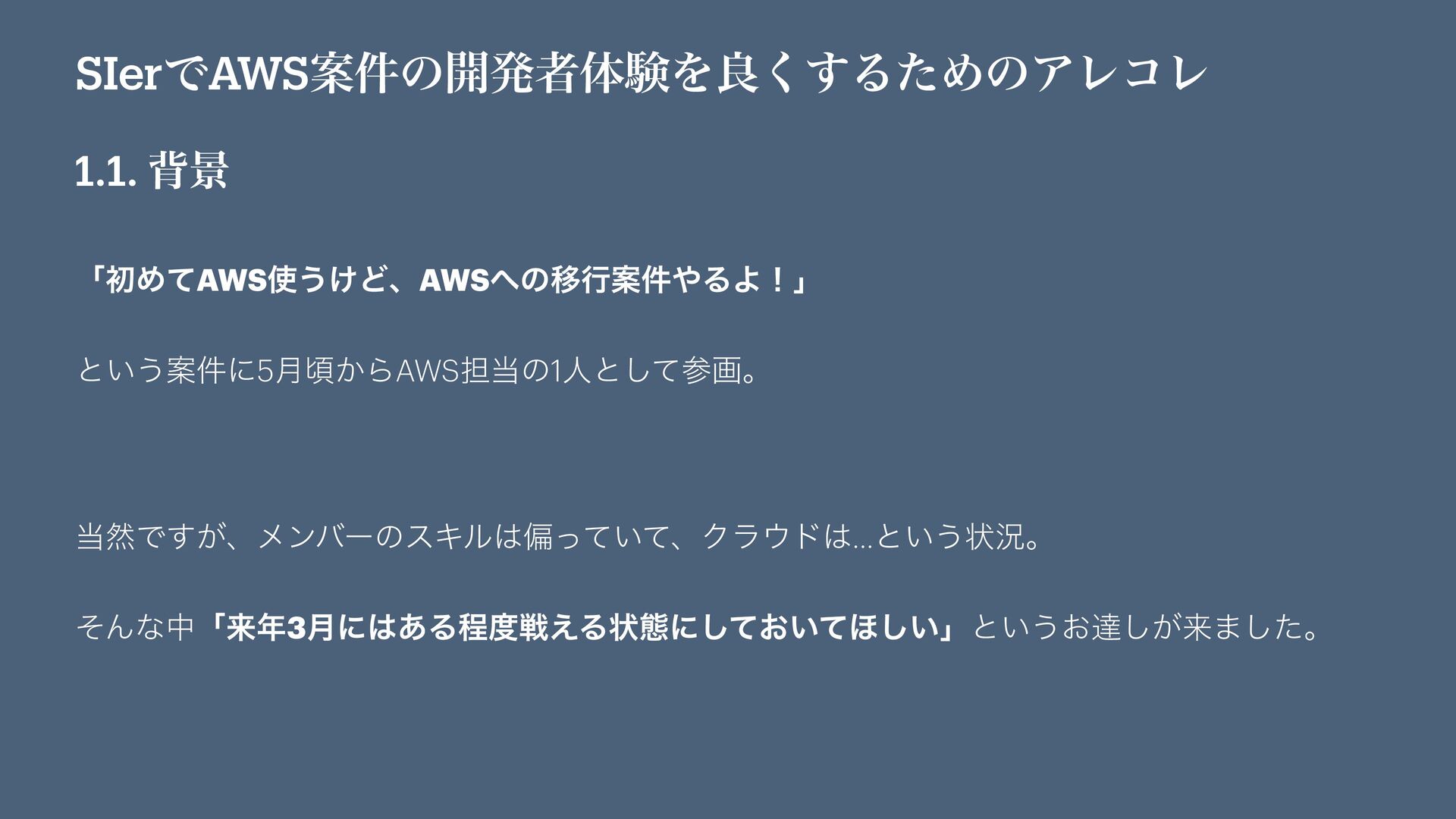 SIerͰAWSҊ݅ͷ։ൃऀମݧΛྑ͘͢ΔͨΊͷΞϨίϨ 1.1. എܠ ʮॳΊͯAWS͏͚ͲɺAWSͷҠߦҊ݅ΔΑʂʯ ͱ͍͏Ҋ݅ʹ5݄ࠒ͔ΒAWS୲ͷ1ਓͱͯ͠ࢀըɻ વͰ͕͢ɺϝϯόʔͷεΩϧภ͍ͬͯͯɺΫϥυ…ͱ͍͏ঢ়گɻ ͦΜͳதʮདྷ3݄ʹ͋Δఔઓ͑Δঢ়ଶʹ͓͍ͯͯ͠΄͍͠ʯͱ͍͏͓ୡ͕͠དྷ·ͨ͠ɻ