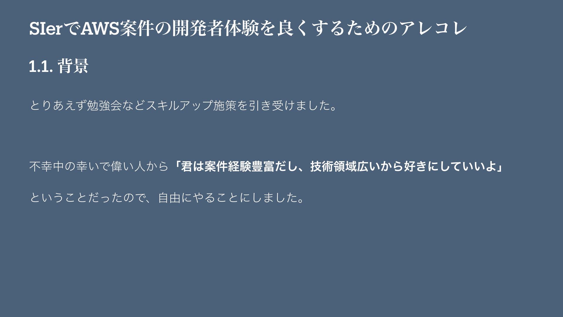 SIerͰAWSҊ݅ͷ։ൃऀମݧΛྑ͘͢ΔͨΊͷΞϨίϨ 1.1. എܠ ͱΓ͋͑ͣษڧձͳͲεΩϧΞοϓࢪࡦΛҾ͖ड͚·ͨ͠ɻ ෆதͷ͍ͰҒ͍ਓ͔Βʮ܅Ҋ݅ܦݧ๛ͩ͠ɺٕज़ྖҬ͍͔Β͖ʹ͍͍ͯ͠Αʯ ͱ͍͏͜ͱͩͬͨͷͰɺࣗ༝ʹΔ͜ͱʹ͠·ͨ͠ɻ