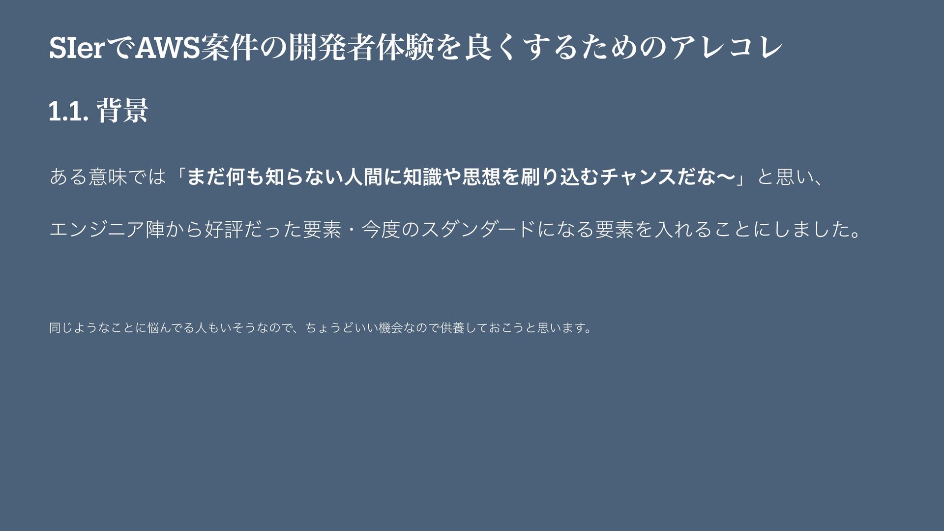 SIerͰAWSҊ݅ͷ։ൃऀମݧΛྑ͘͢ΔͨΊͷΞϨίϨ 1.1. എܠ ͋ΔҙຯͰʮ·ͩԿΒͳ͍ਓؒʹࣝࢥΛΓࠐΉνϟϯεͩͳʙʯͱࢥ͍ɺ ΤϯδχΞਞ͔ΒධͩͬͨཁૉɾࠓͷεμϯμʔυʹͳΔཁૉΛೖΕΔ͜ͱʹ͠·ͨ͠ɻ ಉ͡Α͏ͳ͜ͱʹΜͰΔਓ͍ͦ͏ͳͷͰɺͪΐ͏Ͳ͍͍ػձͳͷͰڙཆ͓ͯ͜͠͏ͱࢥ͍·͢ɻ