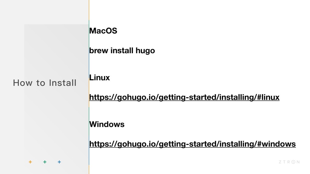How to Install MacOS brew install hugo Linux https://gohugo.io/getting-started/installing/#linux Windows