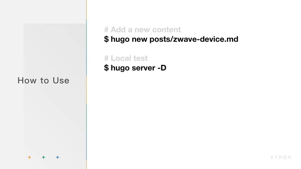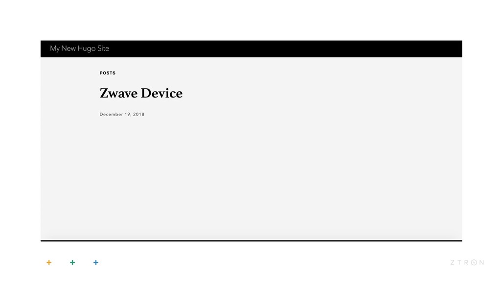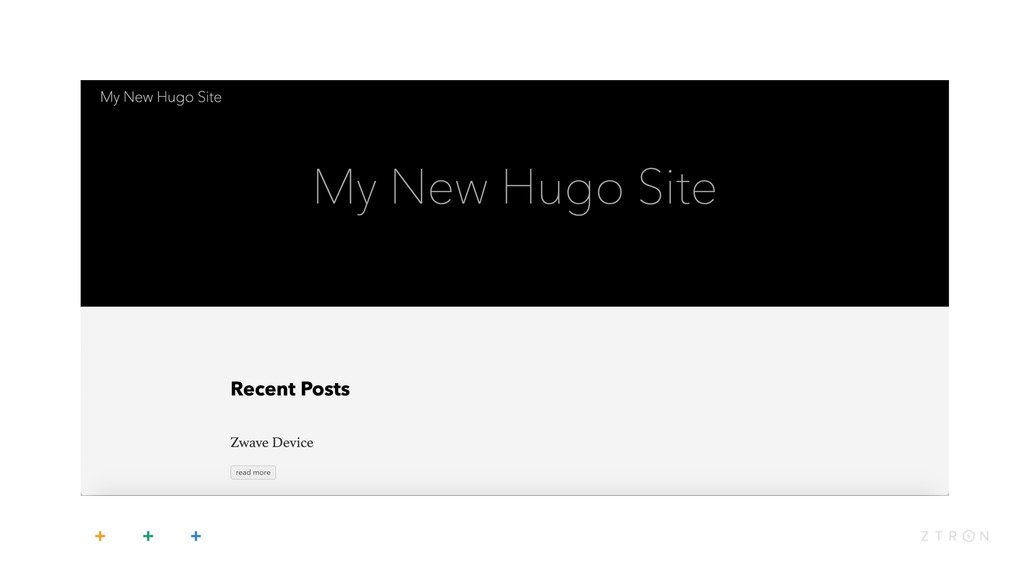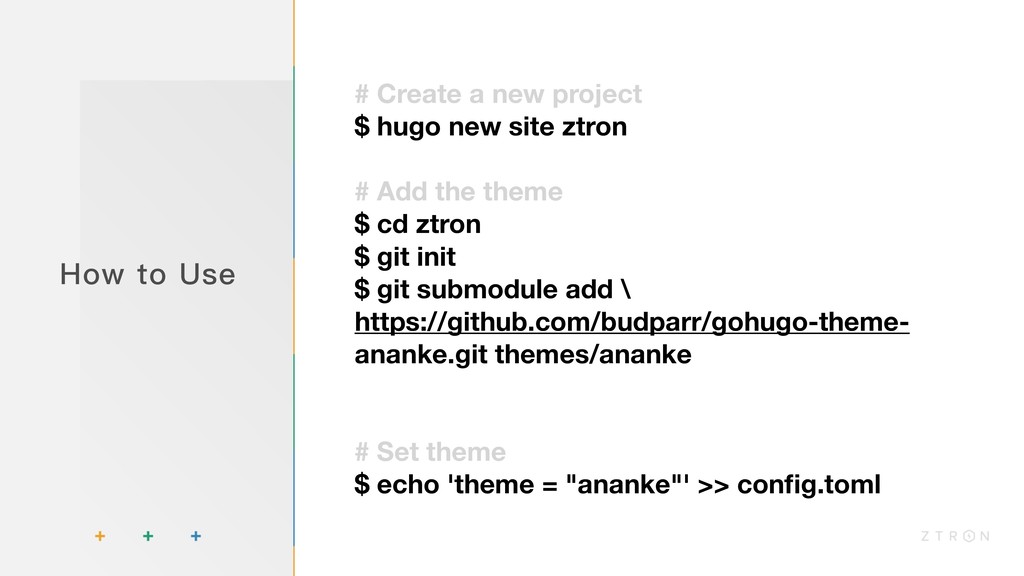 new site ztron # Add the theme $ cd ztron $ git init $ git submodule add \ https://github.com/budparr/gohugo-theme- ananke.git themes/ananke # Set theme $ echo 'theme = "ananke"' >> config.toml