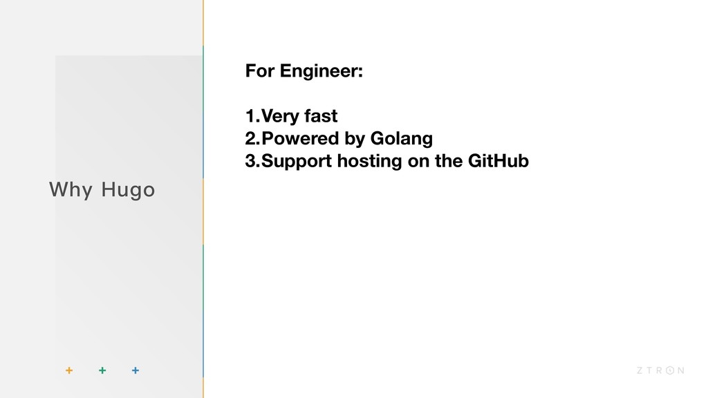 Why Hugo For Engineer: 1.Very fast 2.Powered by Golang 3.Support