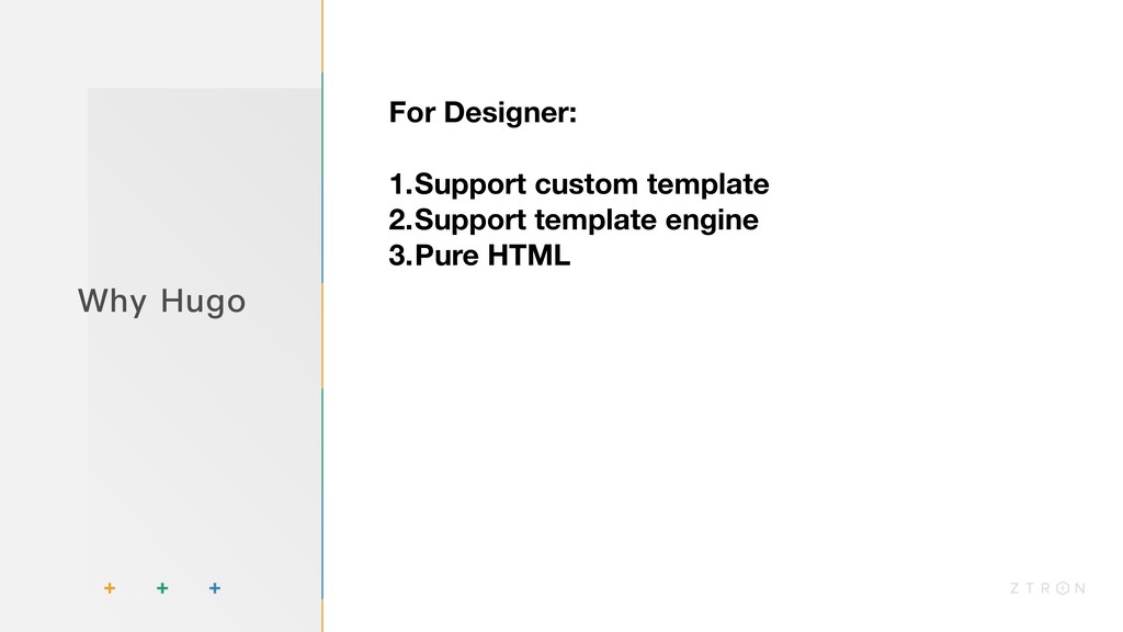 Why Hugo For Designer: 1.Support custom template 2.Support template engine