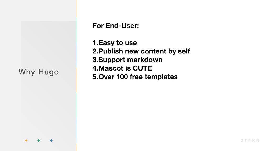 Why Hugo For End-User: 1.Easy to use 2.Publish new content