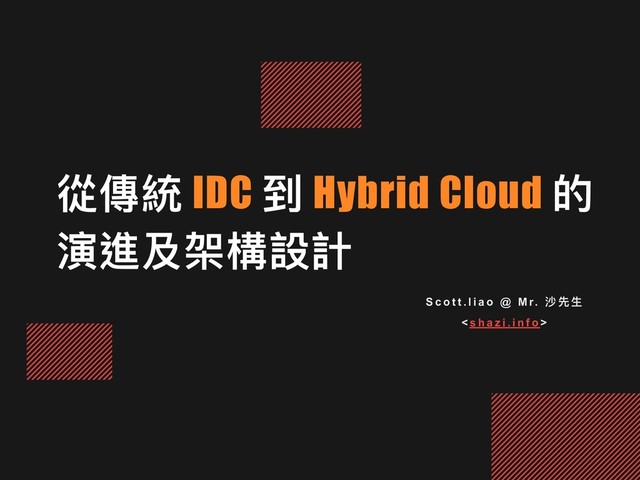 2016 年底的 104 是傳統 IDC 架構,2019 年的現在是 AWS + IDC 的 Hybrid Cloud 架構,擁有 120 以上的 AWS 帳號,在這段時間 104 如何邁向 AWS 雲端以及技術選型,從初建 Hybrid Cloud 到現在穩定的架構又踩了多少坑,這場分享將帶給各位這段期間的辛酸歷程 (哭