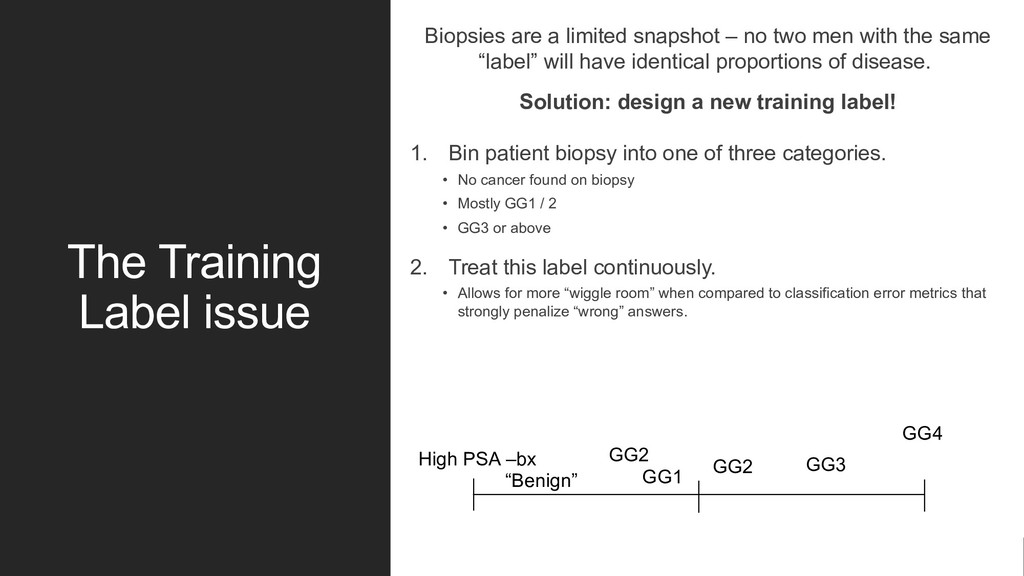 no two men with the same “label” will have identical proportions of disease. Solution: design a new training label! 1. Bin patient biopsy into one of three categories. • No cancer found on biopsy • Mostly GG1 / 2 • GG3 or above 2. Treat this label continuously. • Allows for more “wiggle room” when compared to classification error metrics that strongly penalize “wrong” answers. GG2 GG2 GG1 High PSA –bx GG3 GG4 “Benign”