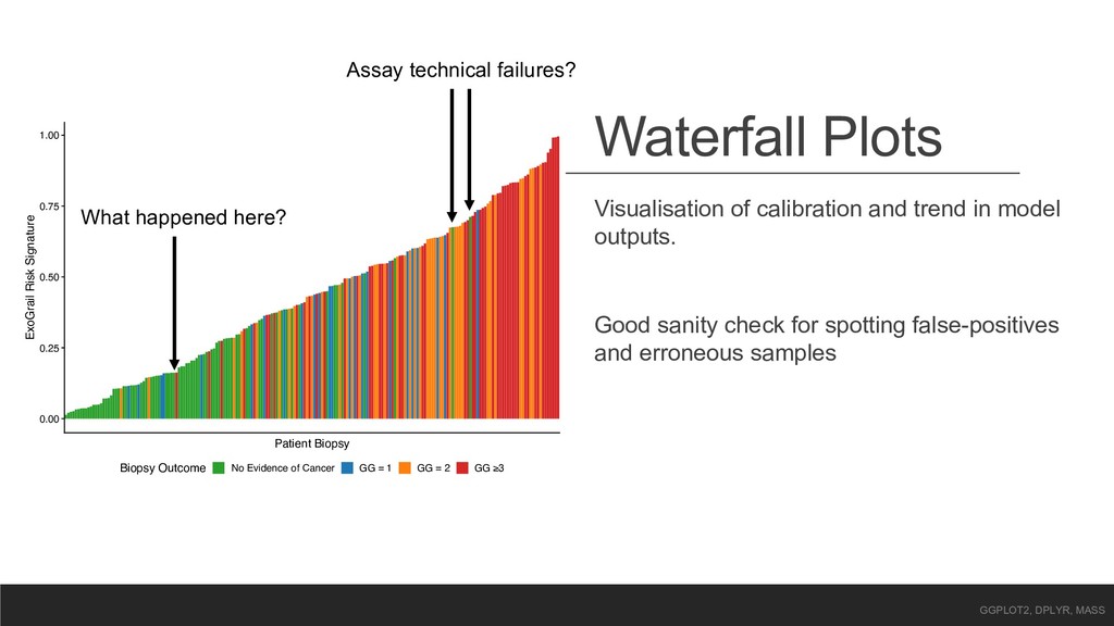 Risk Signature Biopsy Outcome No Evidence of Cancer GG = 1 GG = 2 GG ≥3 Visualisation of calibration and trend in model outputs. Good sanity check for spotting false-positives and erroneous samples OR = 2.04 per 0.1 ExoGrail increase (95% CI: 1.78 - 2.35) GGPLOT2, DPLYR, MASS Assay technical failures? What happened here?