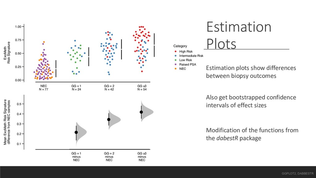 = 1 N = 24 GG = 2 N = 42 GG ≥3 N = 54 ExoMeth Risk Signature Category High Risk Intermediate Risk Low Risk Raised PSA NEC 0.1 0.2 0.3 0.4 0.5 GG = 1 minus NEC GG = 2 minus NEC GG ≥3 minus NEC Mean ExoMeth Risk Signature difference from NEC samples Estimation Plots Estimation plots show differences between biopsy outcomes Also get bootstrapped confidence intervals of effect sizes Modification of the functions from the dabestR package GGPLOT2, DABBESTR