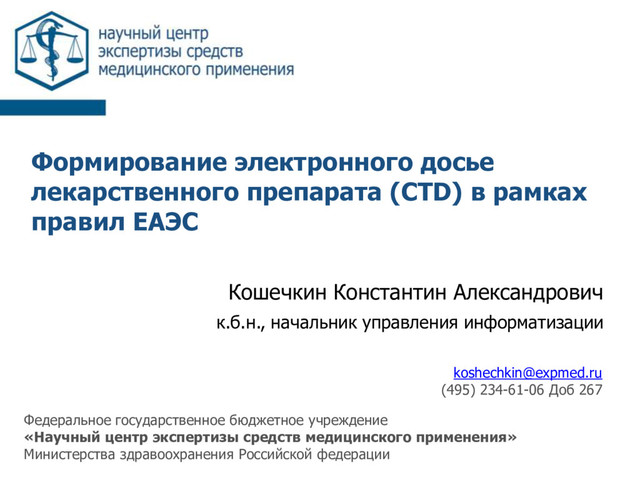 к.б.н., начальник управления информатизации Кошечкин Константин Александрович Федеральное государственное бюджетное учреждение «Научный центр экспертизы средств медицинского применения» Министерства здравоохранения Российской федерации [email protected] (495) 234-61-06 Доб 267