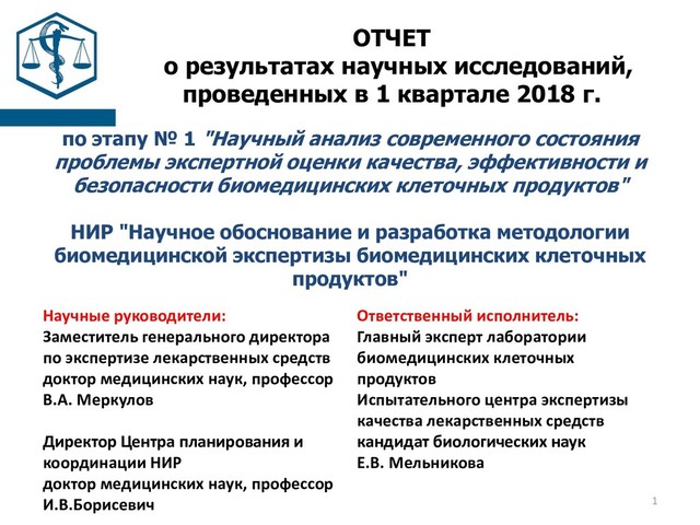 г. по этапу № 1 "Научный анализ современного состояния проблемы экспертной оценки качества, эффективности и безопасности биомедицинских клеточных продуктов" НИР "Научное обоснование и разработка методологии биомедицинской экспертизы биомедицинских клеточных продуктов" Научные руководители: Заместитель генерального директора по экспертизе лекарственных средств доктор медицинских наук, профессор В.А. Меркулов Директор Центра планирования и координации НИР доктор медицинских наук, профессор И.В.Борисевич Ответственный исполнитель: Главный эксперт лаборатории биомедицинских клеточных продуктов Испытательного центра экспертизы качества лекарственных средств кандидат биологических наук Е.В. Мельникова 1