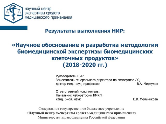 стран (ЕС, США, Япония, Южная Корея и др.) с национальным и законодательством ЕАЭС в области регулирования разработки, производства, проведения ДКИ и КИ, вывода на рынок препаратов на основе жизнеспособных клеток человека (БМКП) Планирование ДКИ и КИ БМКП в соответствии с национальными требованиями (программа, алгоритм) Стратегия оценки качества Опыт разработки, производства, проведения ДКИ и КИ, вывода на рынок зарегистрированных в мире аналогов БМКП (на основе публичных отчетов ЕМА, FDA, PMDA, Clinicaltrials.gov): -Аутологичные и аллогенные -Для лечения онкологических, генетических заболеваний и для применения в регенеративной медицине - на основе разных типов клеток (МСК, дифференцированные, генетически модифицированные клетки) Формирование научно-методических принципов и критериев экспертной оценки качества, результатов ДКИ и КИ БМКП: РУКОВОДСТВО по биомедицинской экспертизе БМКП Задачи 1,7 ДКИ препаратов, принятые регуляторными органами Особенности КИ, на основе которых зарегистрированы аналоги БМКП Выводы по оценке отношения «пользы-риска» Задачи 2,7 Задачи 5,6 Задачи 4,6 Задачи 5,6 Задачи 2,6,7 Коллекция образцов стандартизованных КЛ, ИАБ Задачи 3,7 Программа Экспериментальные аспекты экспертной оценки качества и безопасности КЛ (модельных), входящих в состав БМКП Методология биомедицинской экспертизы Задача 7 Опыт научного консультирования Задача 7