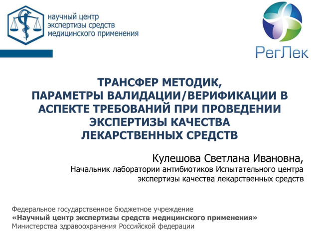 КАЧЕСТВА ЛЕКАРСТВЕННЫХ СРЕДСТВ Кулешова Светлана Ивановна, Начальник лаборатории антибиотиков Испытательного центра экспертизы качества лекарственных средств Федеральное государственное бюджетное учреждение «Научный центр экспертизы средств медицинского применения» Министерства здравоохранения Российской федерации