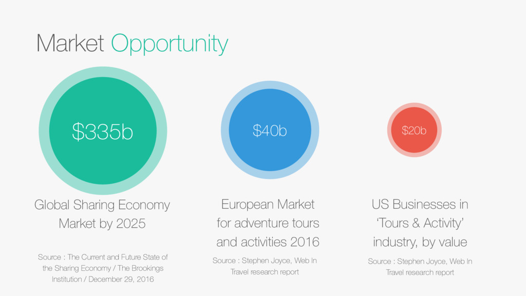 European Market for adventure tours and activities 2016 $20b US Businesses in ‘Tours & Activity’ industry, by value Source : The Current and Future State of the Sharing Economy / The Brookings Institution / December 29, 2016 Source : Stephen Joyce, Web In Travel research report Source : Stephen Joyce, Web In Travel research report