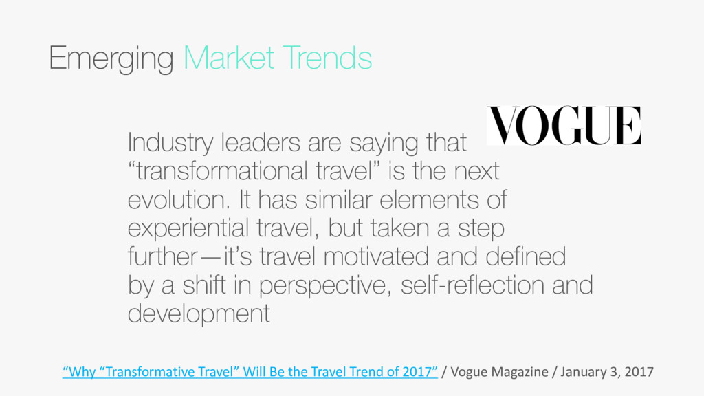 Trend of 2017” / Vogue Magazine / January 3, 2017 Industry leaders are saying that “transformational travel” is the next evolution. It has similar elements of experiential travel, but taken a step further—it’s travel motivated and defined by a shift in perspective, self-reflection and development