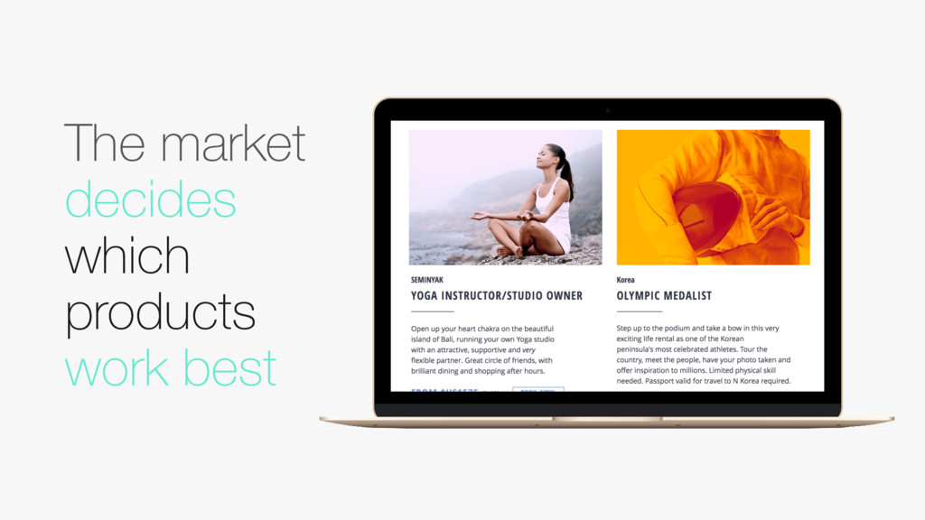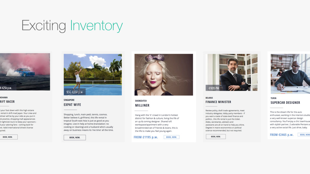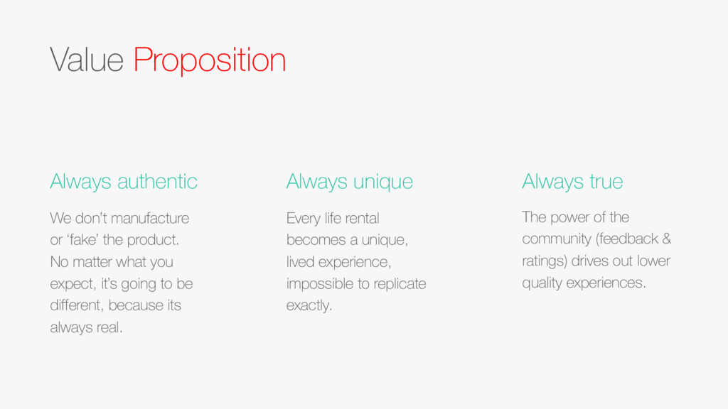 rental becomes a unique, lived experience, impossible to replicate exactly. We don’t manufacture or ‘fake’ the product. No matter what you expect, it’s going to be different, because its always real. The power of the community (feedback & ratings) drives out lower quality experiences.