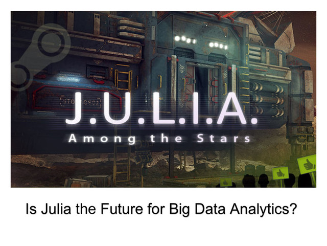 open source in 2012 The ‘alpha’ version is under development 2. Uses LLVM to produce speeds similar to C and Java 3. Has LISP-like macros and ‘generated’ functions 4. Has genuine shared memory and multi-tasking 5. Easy connectivity to C and Python; R, Java and C++ are also possible. 6. Solves the ‘two-language’ problem 7. Build with parallel/distributed processing in mind