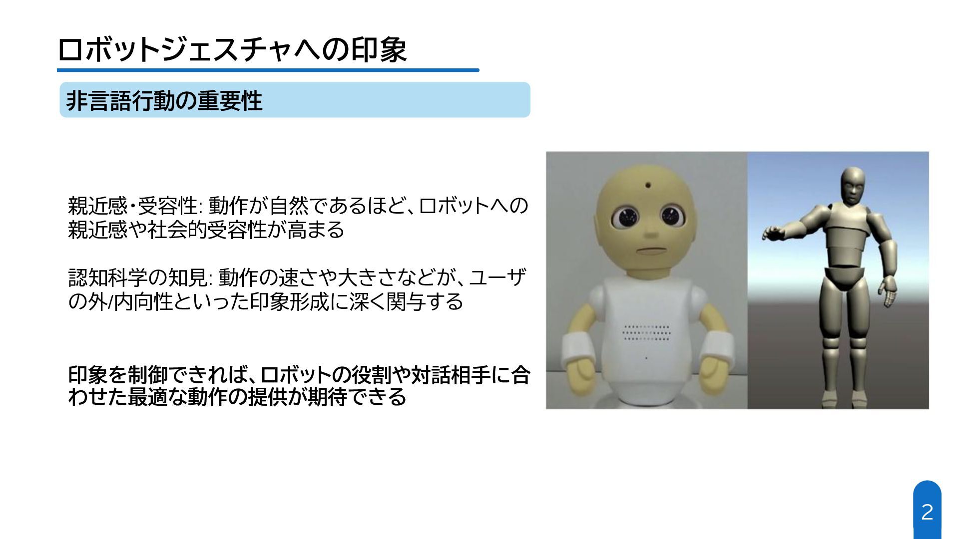 2 ロボットジェスチャへの印象 非言語行動の重要性 親近感・受容性: 動作が自然であるほど、ロボットへの 親近感や社会的受容性が高まる 認知科学の知見: 動作の速さや大きさなどが、ユーザ の外/内向性といった印象形成に深く関与する 印象を制御できれば、ロボットの役割や対話相手に合
