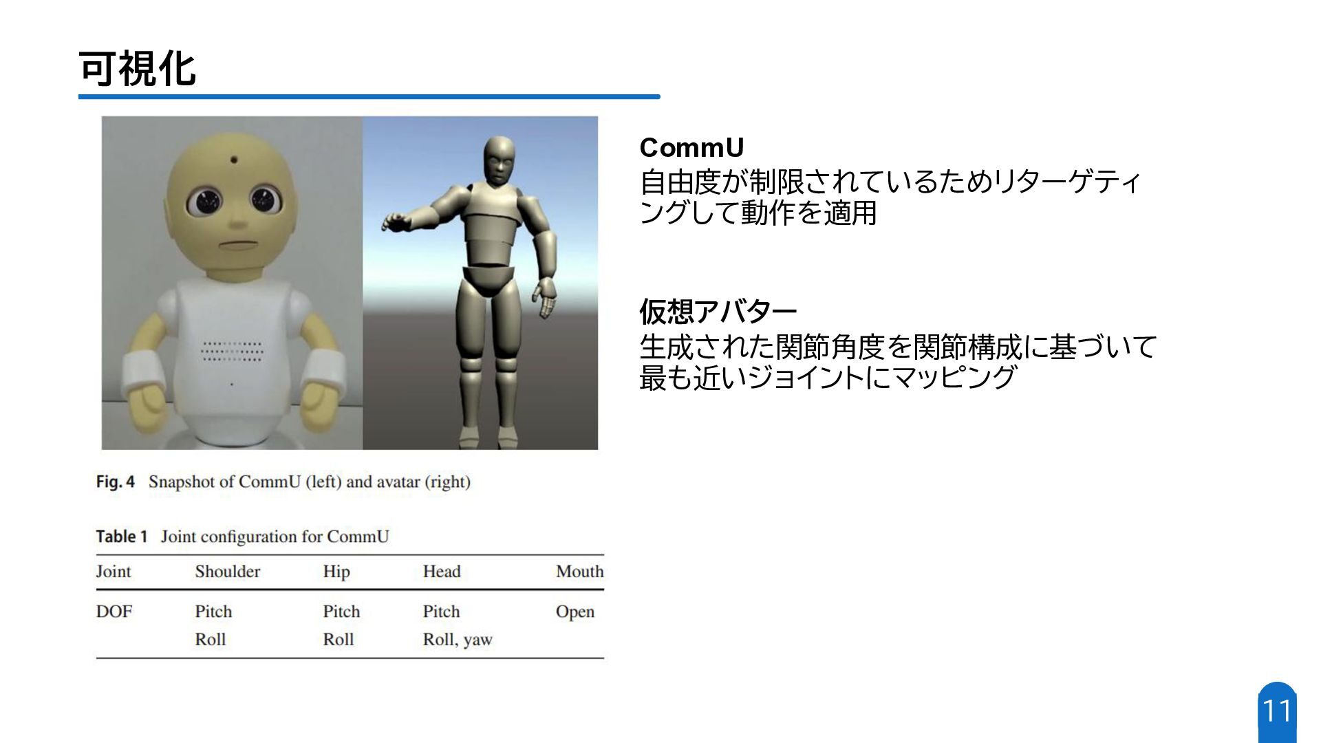 11 可視化 CommU 自由度が制限されているためリターゲティ ングして動作を適用 仮想アバター 生成された関節角度を関節構成に基づいて 最も近いジョイントにマッピング
