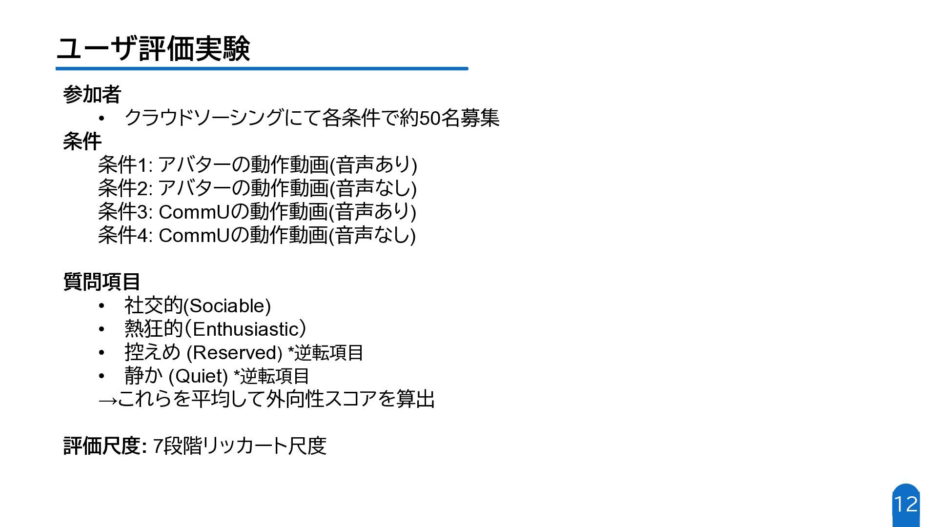 条件3: CommUの動作動画(音声あり) 条件4: CommUの動作動画(音声なし) 質問項目 • 社交的(Sociable) • 熱狂的(Enthusiastic) • 控えめ (Reserved) *逆転項目 • 静か (Quiet) *逆転項目 →これらを平均して外向性スコアを算出 評価尺度: 7段階リッカート尺度