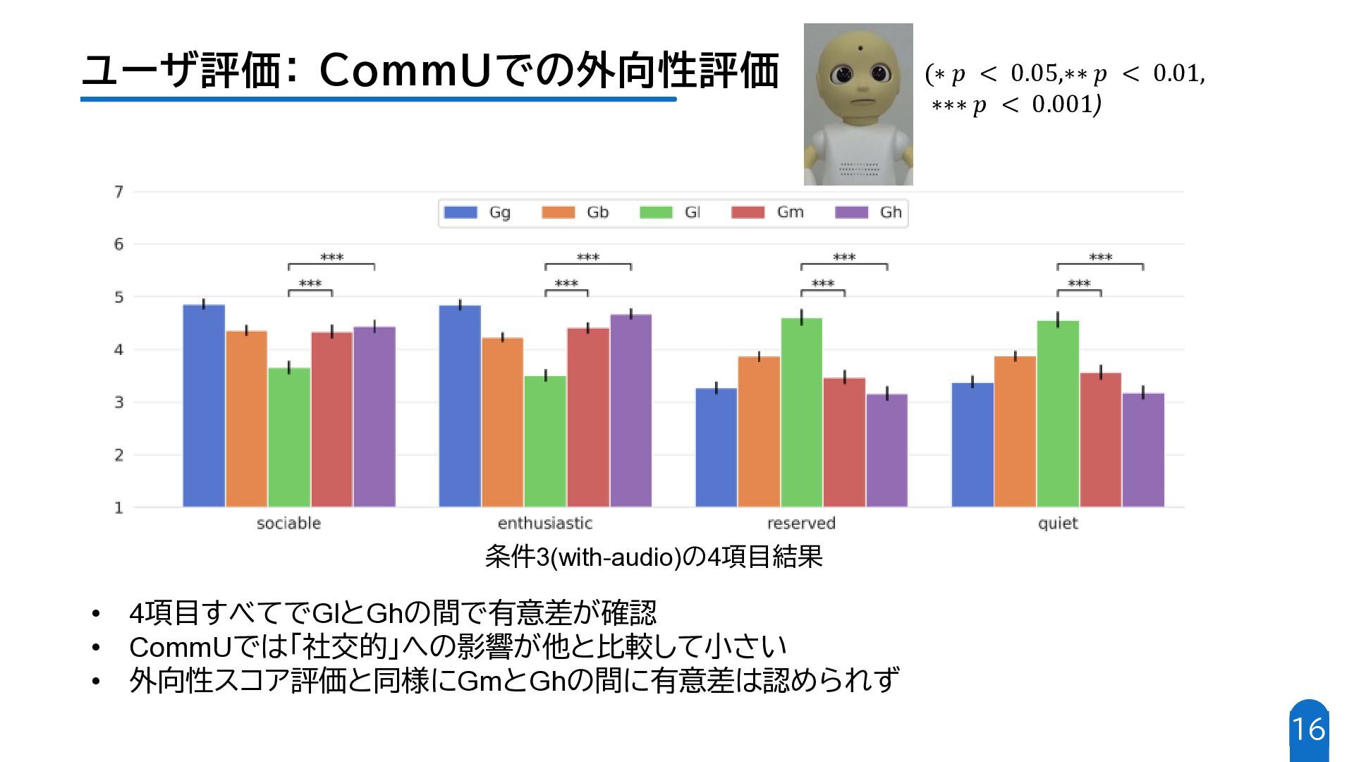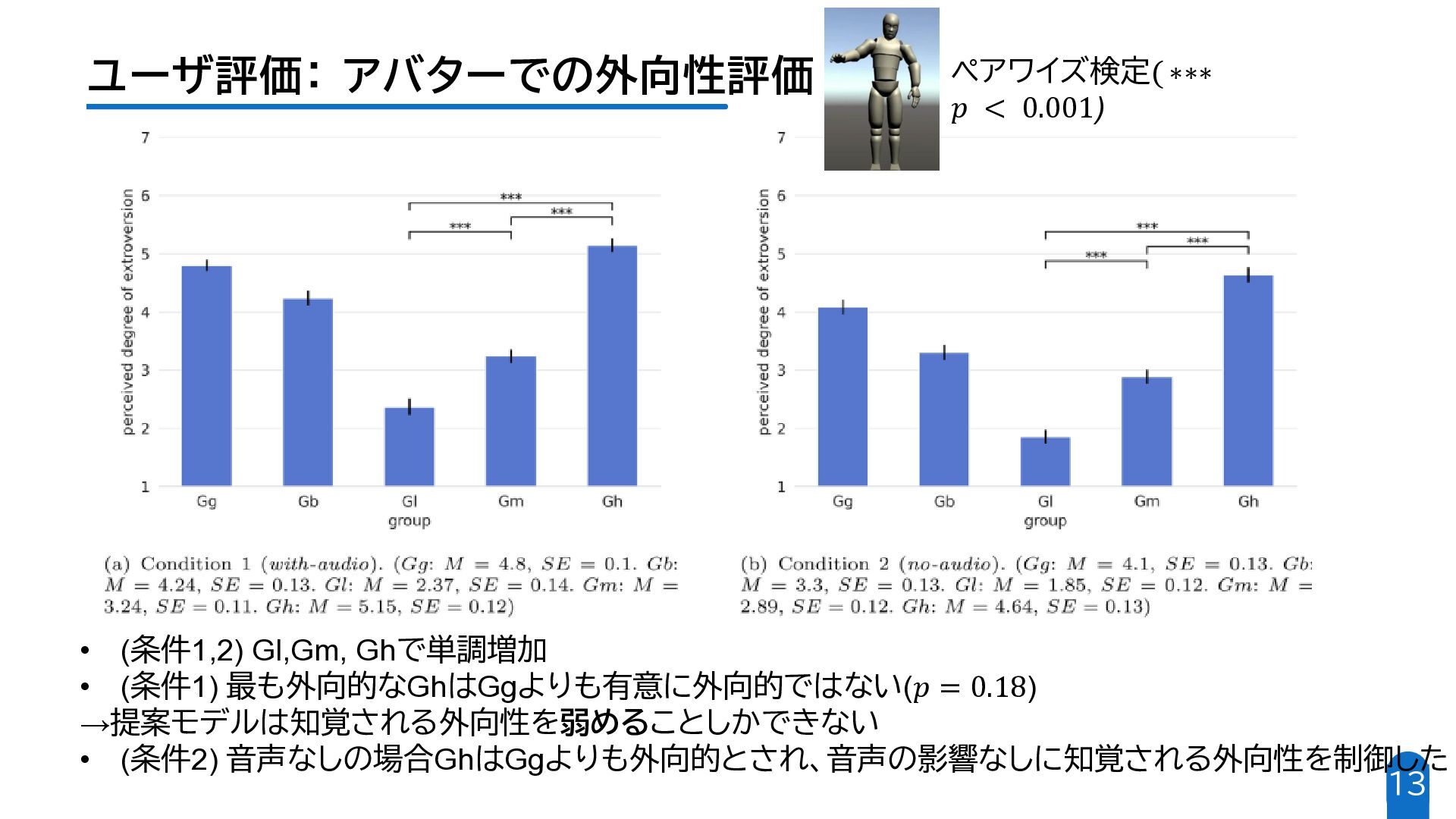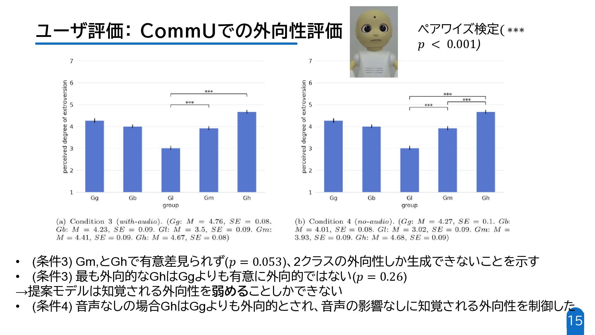 = 0.18) →提案モデルは知覚される外向性を弱めることしかできない • (条件2) 音声なしの場合GhはGgよりも外向的とされ、音声の影響なしに知覚される外向性を制御した ペアワイズ検定( ∗∗∗ 𝑝 < 0.001)