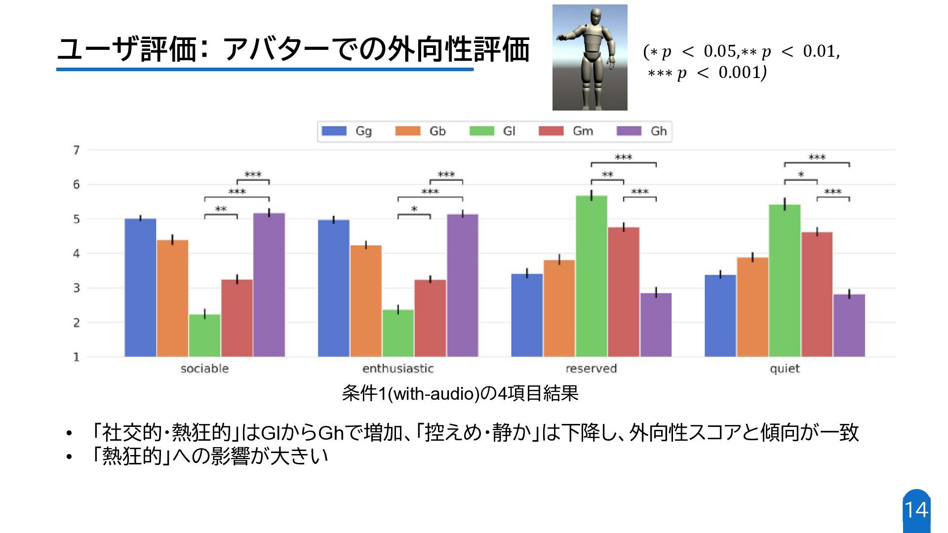 13 ユーザ評価: アバターでの外向性評価 • (条件1,2) Gl,Gm, Ghで単調増加 • (条件1) 最も外向的なGhはGgよりも有意に外向的ではない(𝑝