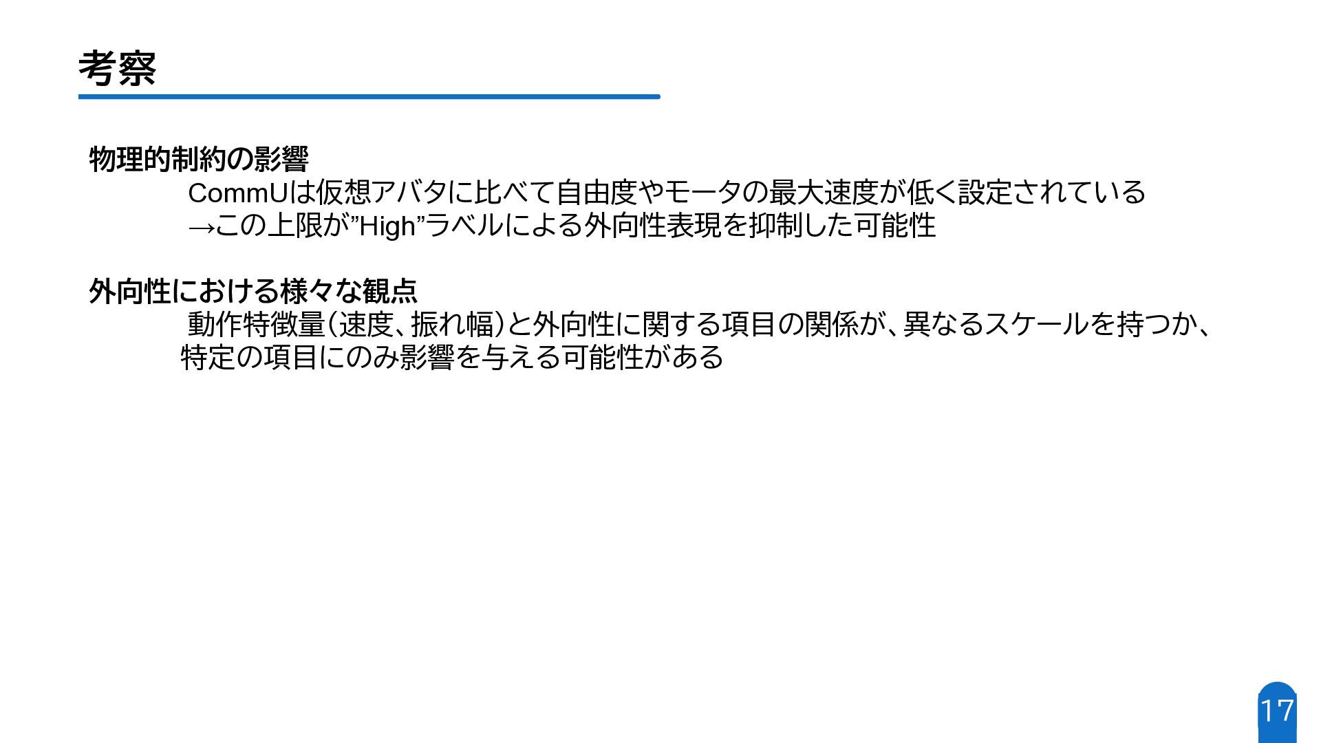 17 考察 物理的制約の影響 CommUは仮想アバタに比べて自由度やモータの最大速度が低く設定されている →この上限が”High”ラベルによる外向性表現を抑制した可能性 外向性における様々な観点 動作特徴量(速度、振れ幅)と外向性に関する項目の関係が、異なるスケールを持つか、 特定の項目にのみ影響を与える可能性がある