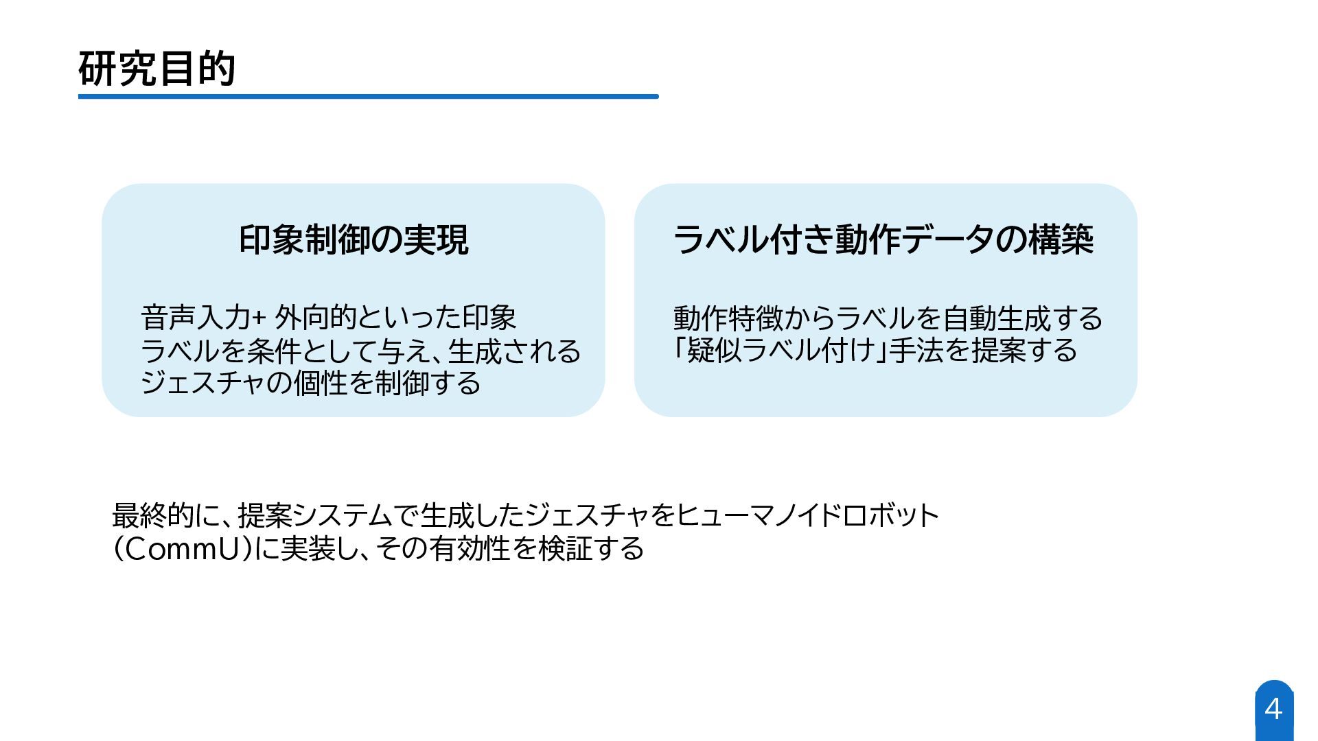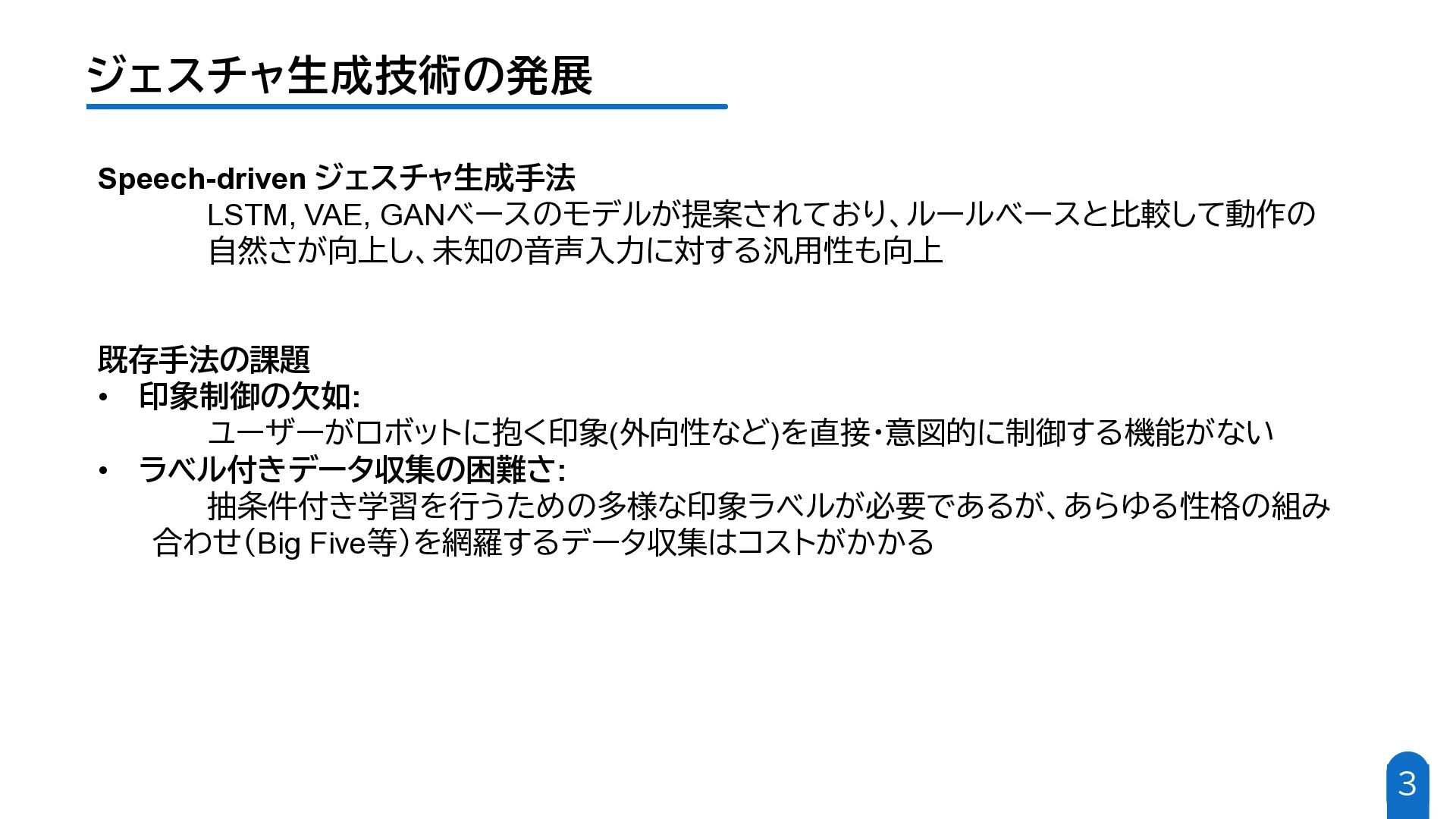 印象制御の欠如: ユーザーがロボットに抱く印象(外向性など)を直接・意図的に制御する機能がない • ラベル付きデータ収集の困難さ: 抽条件付き学習を行うための多様な印象ラベルが必要であるが、あらゆる性格の組み 合わせ(Big Five等)を網羅するデータ収集はコストがかかる