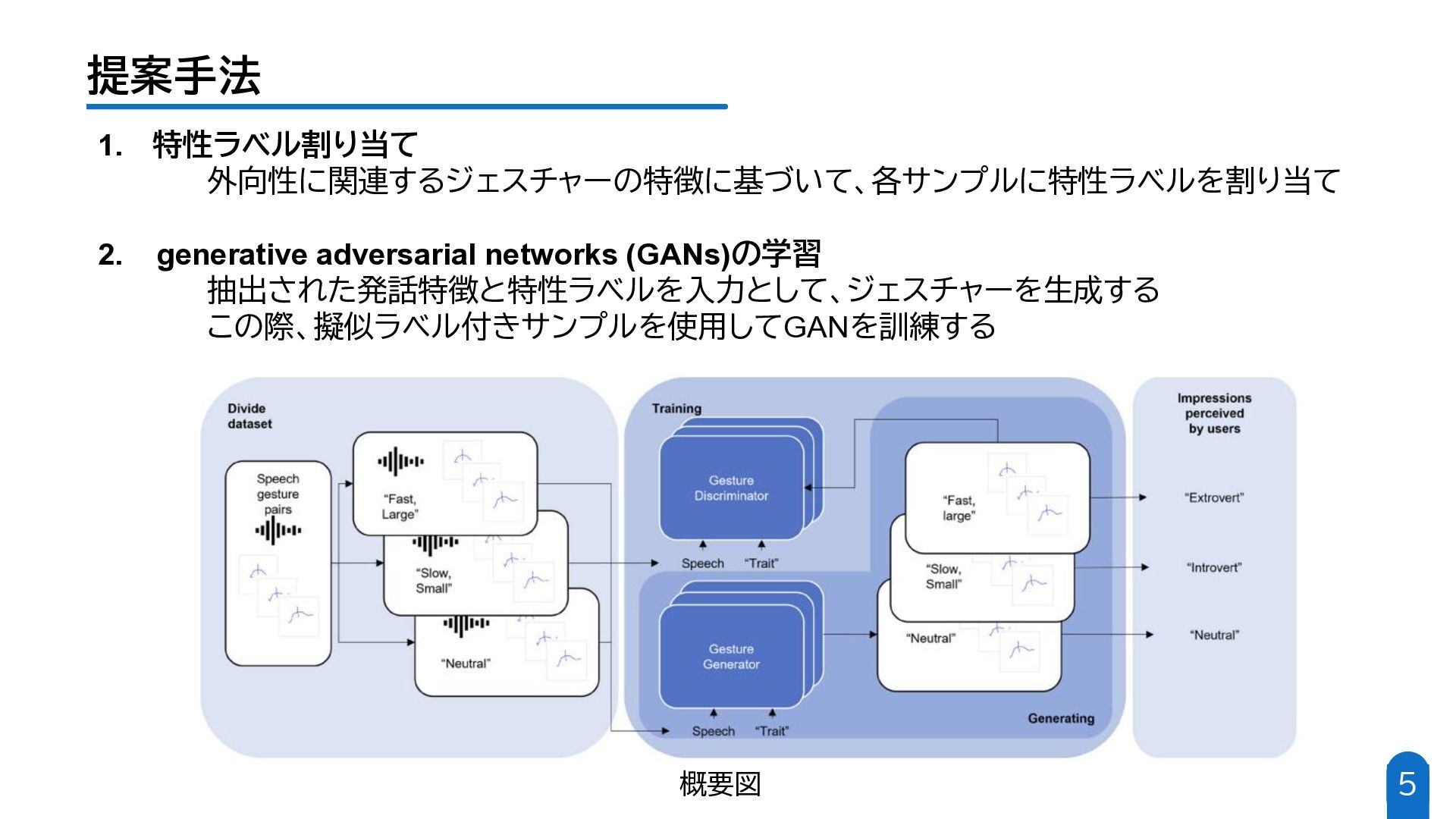 4 研究目的 音声入力+ 外向的といった印象 ラベルを条件として与え、生成される ジェスチャの個性を制御する 印象制御の実現 動作特徴からラベルを自動生成する 「疑似ラベル付け」手法を提案する ラベル付き動作データの構築
