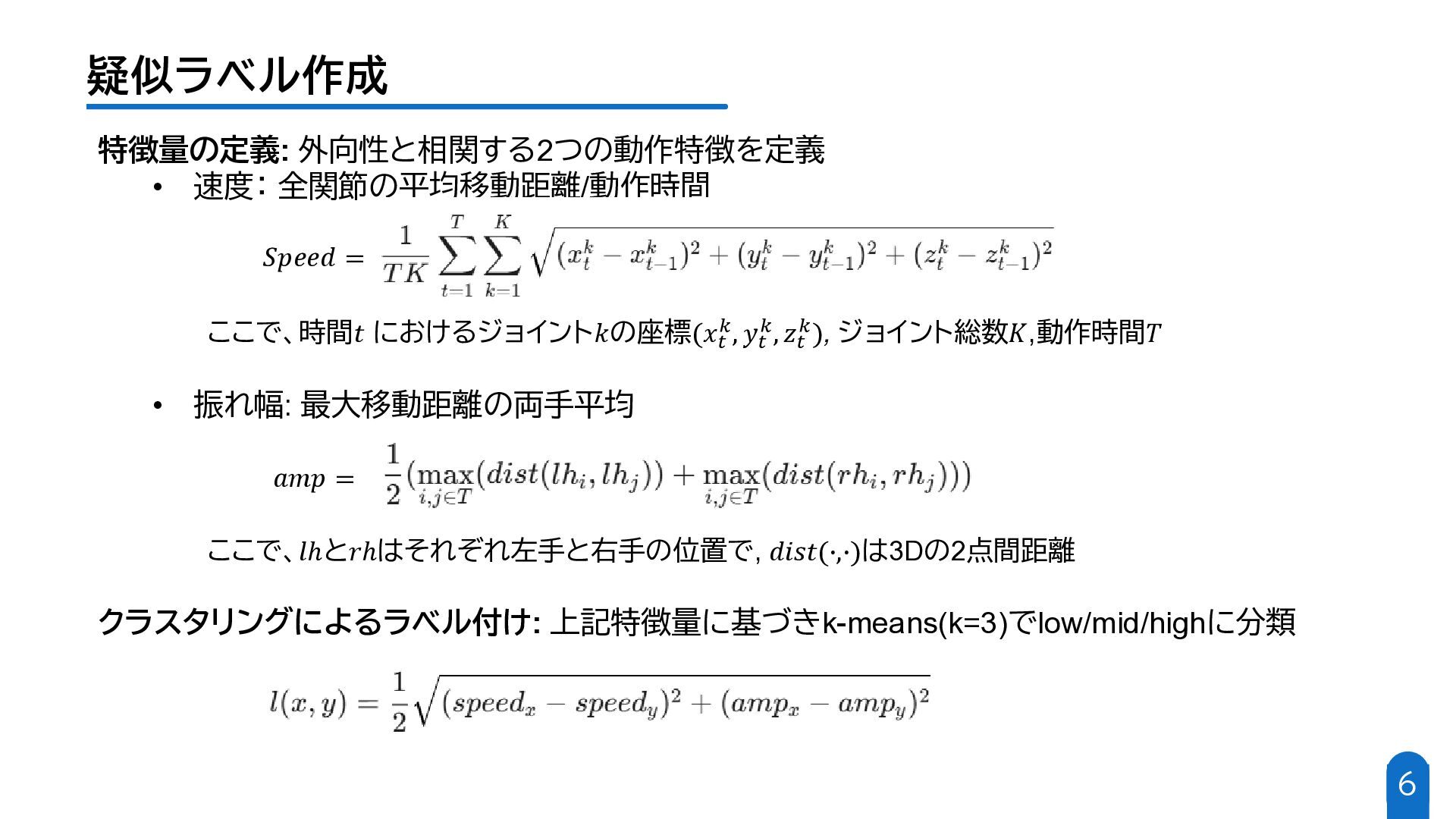 𝑦𝑡 𝑘, 𝑧𝑡 𝑘), ジョイント総数𝐾,動作時間𝑇 • 振れ幅: 最大移動距離の両手平均 ここで、𝑙ℎと𝑟ℎはそれぞれ左手と右手の位置で, 𝑑𝑖𝑠𝑡(∙,∙)は3Dの2点間距離 クラスタリングによるラベル付け: 上記特徴量に基づきk-means(k=3)でlow/mid/highに分類 𝑆𝑝𝑒𝑒𝑑 = 𝑎𝑚𝑝 =